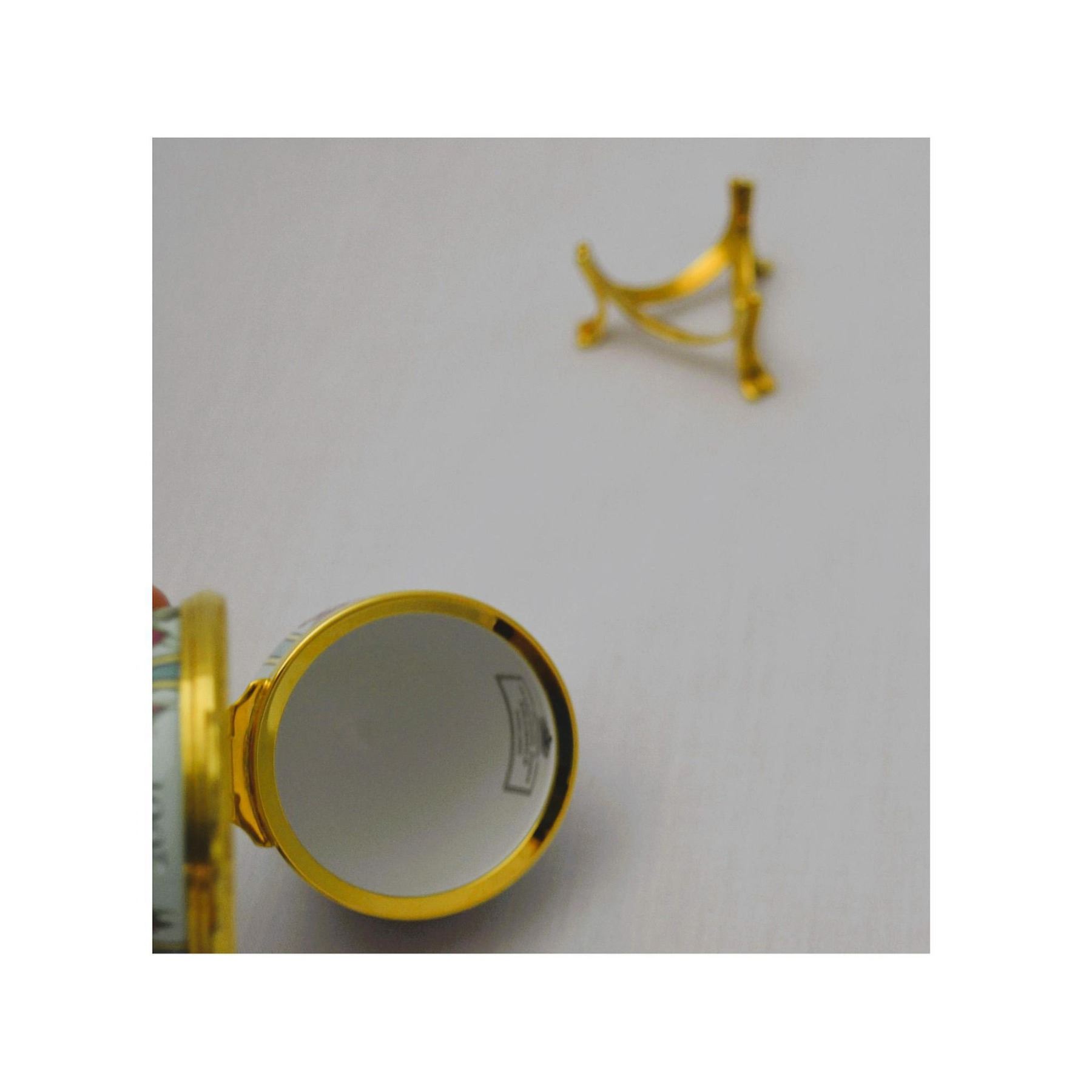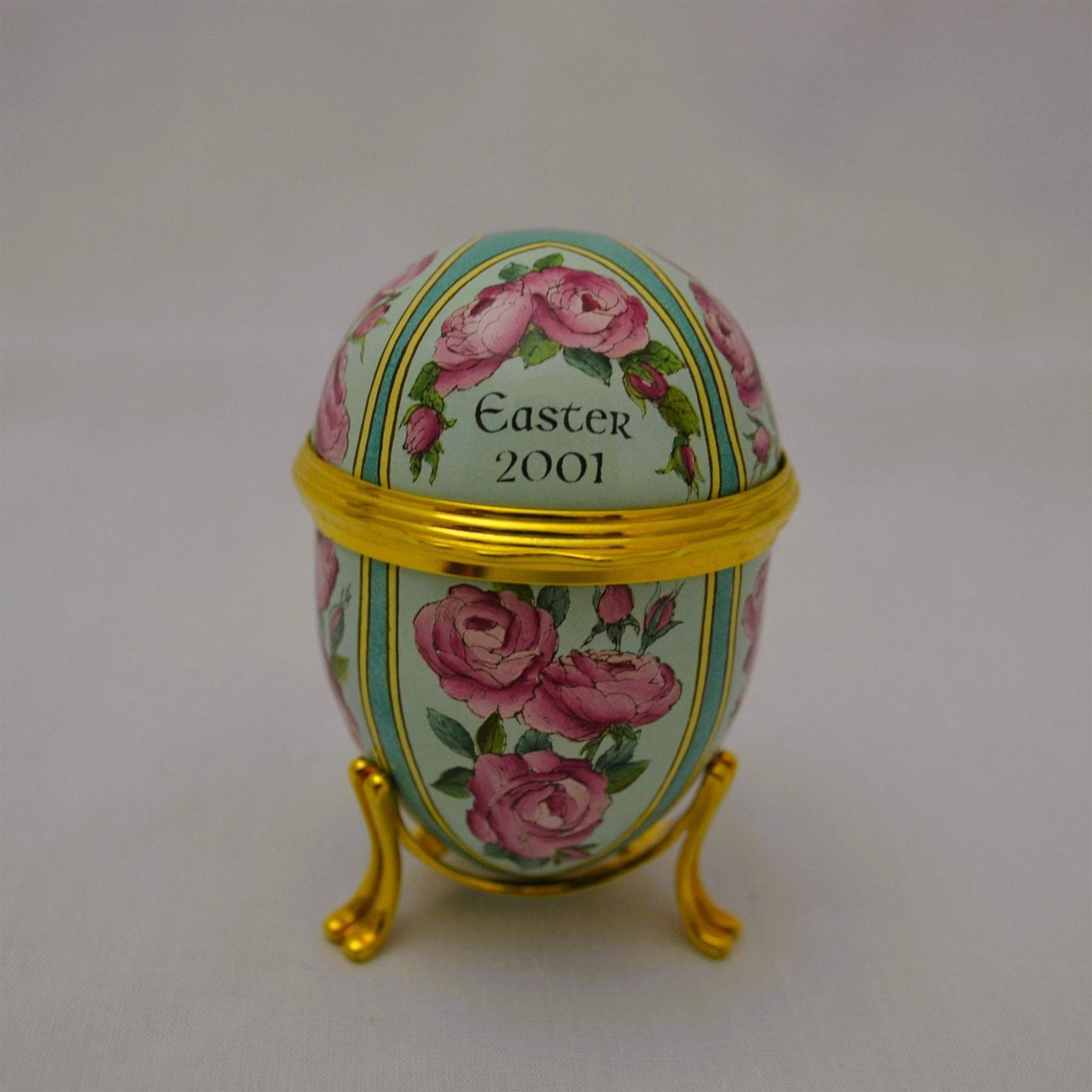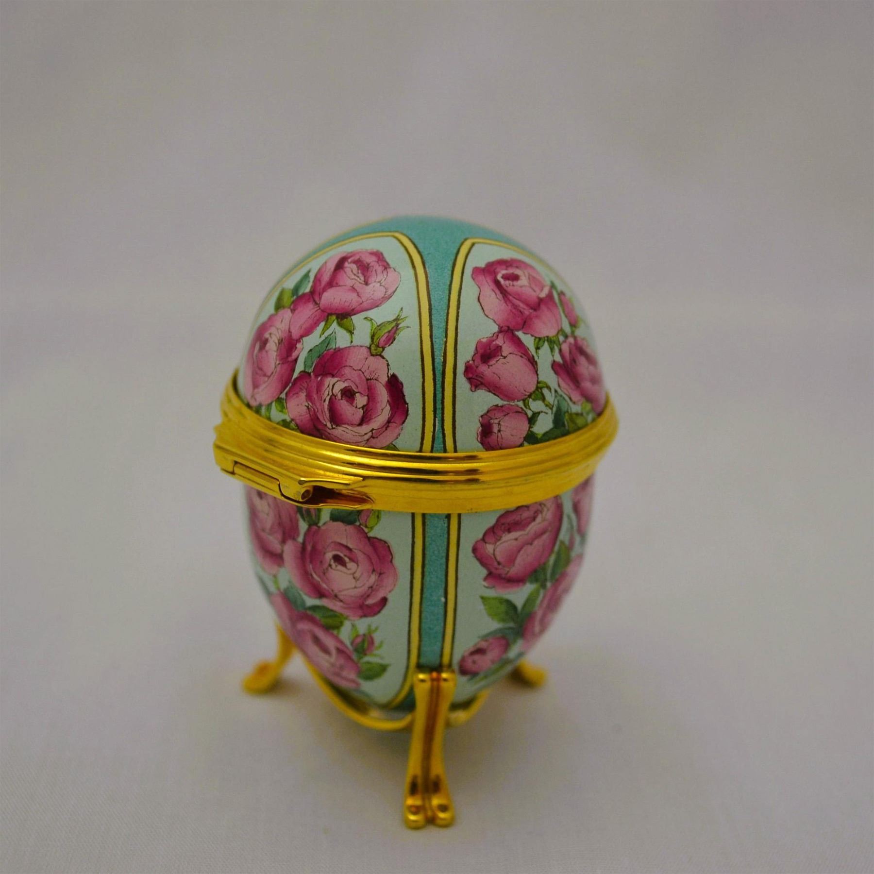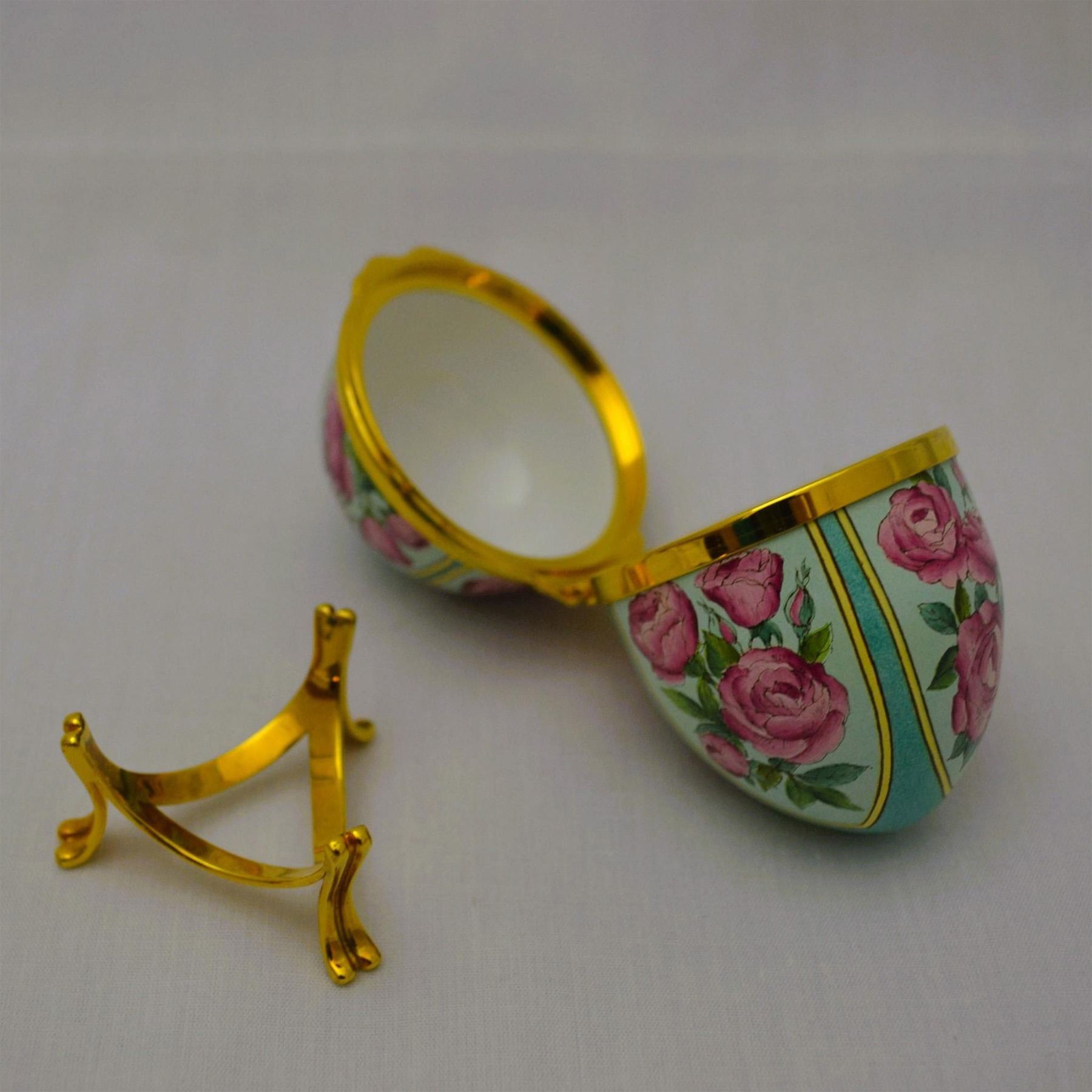 Glazed Porcelain Decorated Egg Trinket Holder by Halacon Days. Featuring a theme of Roses for Easter 2001. A soft Pastel Green background, with Mauve Colored Roses are hand painted surrounding the entire egg. Beautiful detail, gold toned hinges in the center of the egg, for opening and closing the egg trinket box. Gold toned stand included. From the Archival Collection of Re Vann Galleries, G.Reasoner, Owner.