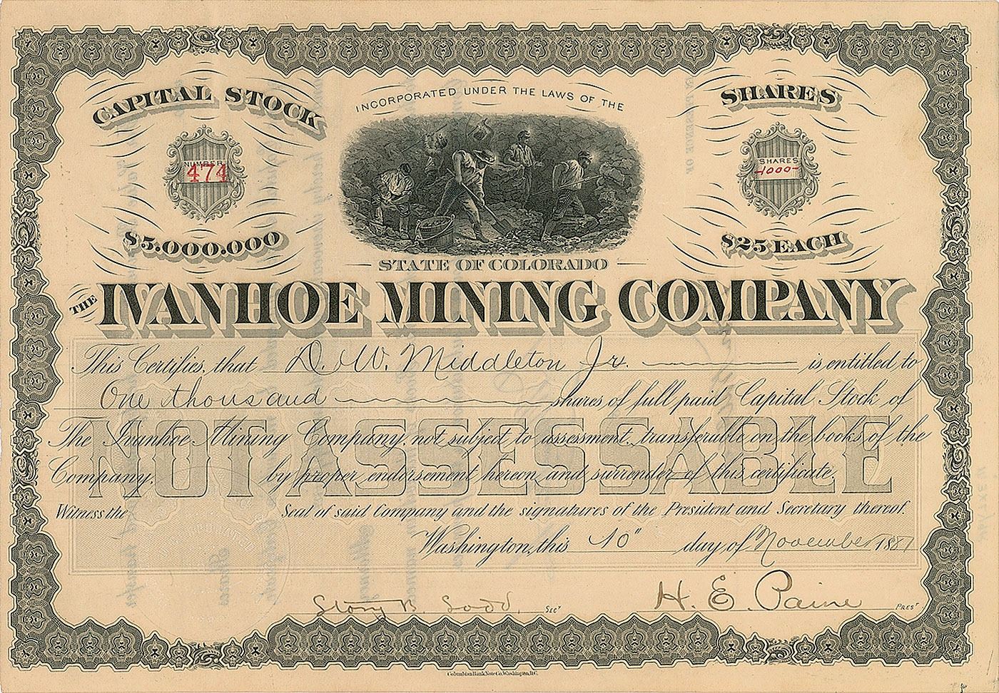 Union general who lost his leg at the Battle of Port Hudson, and was later elected to Congress (1826–1905). Partly-printed DS, signed “H. E. Paine,” one page, 10.5 x 7.25, January 10, 1881. Stock certificate issued to D. W. Middleton, Jr., for 1,000 shares of the Ivanhoe Mining Company, signed at the conclusion by Paine as the company's president. The certificate boasts an appealing vignette portraying miners hard at work. In fine condition.