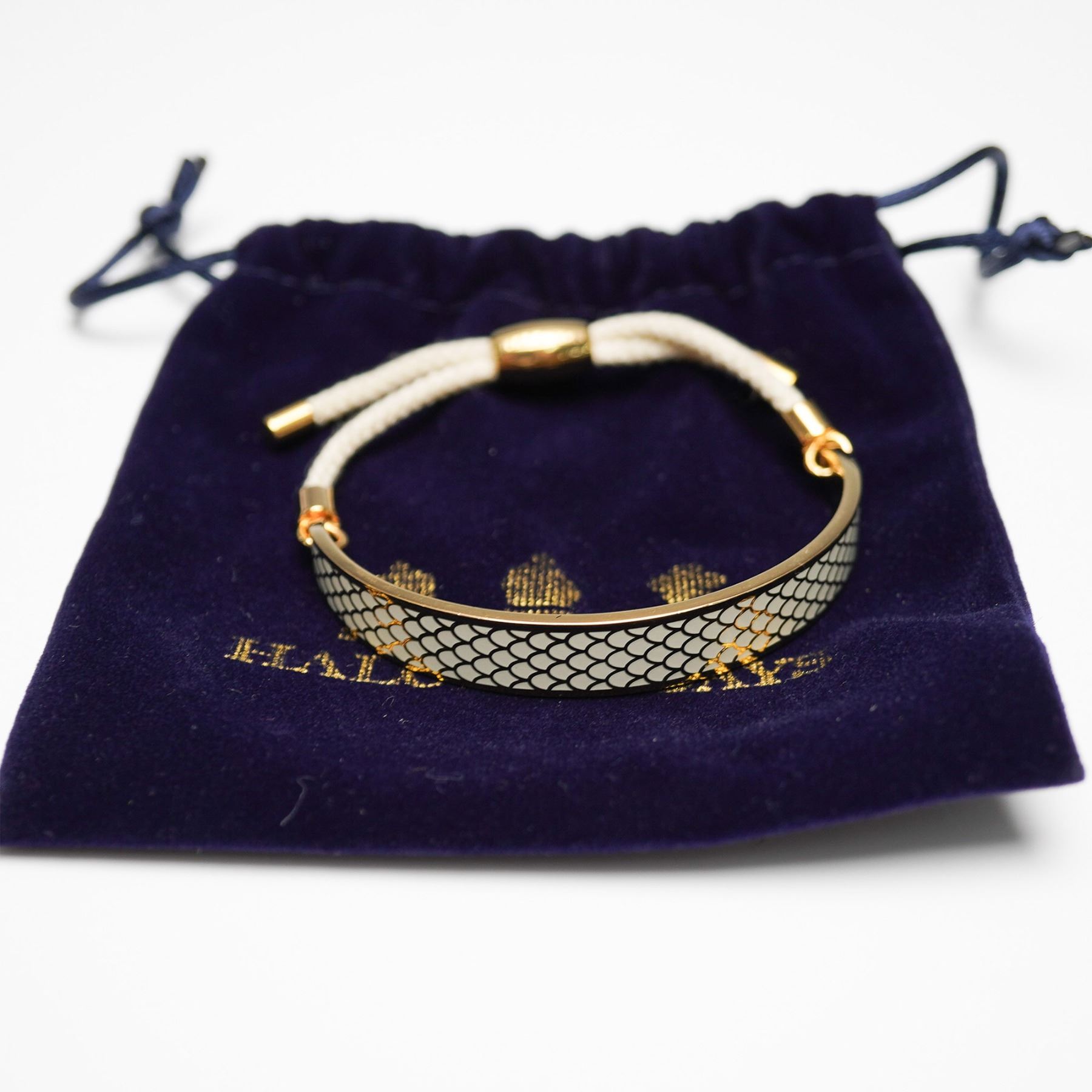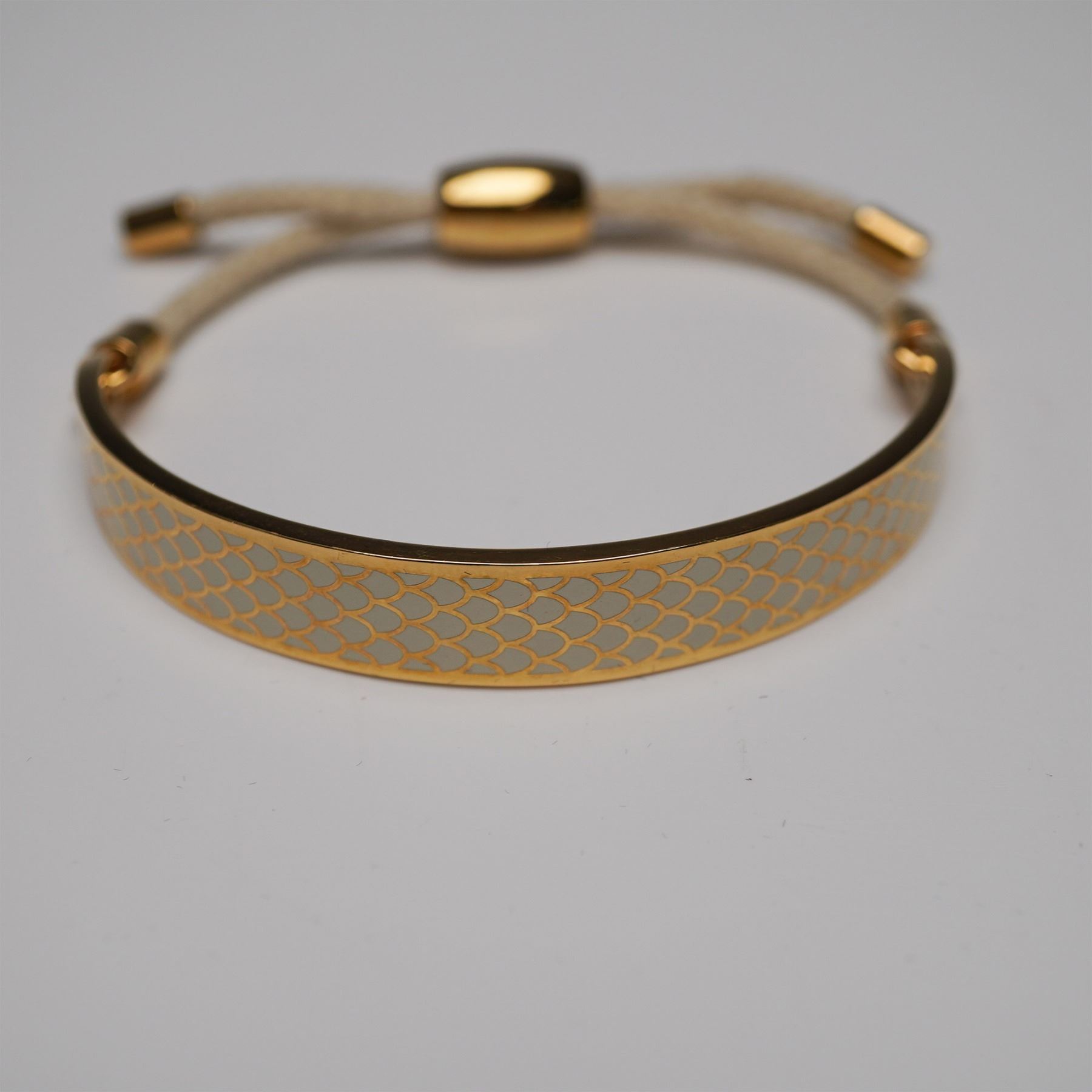 Halcyon Days gold-plated enamel bracelet featuring an intricate fish scale pattern in gold and cream tones. The bangle-style bracelet is complemented by an adjustable cream-colored drawstring cord with gold-tone metal accents, ensuring a comfortable fit. The bracelet bears the Halcyon marking, confirming its authenticity. Includes its original Halcyon Days velvet pouch with gold lettering.