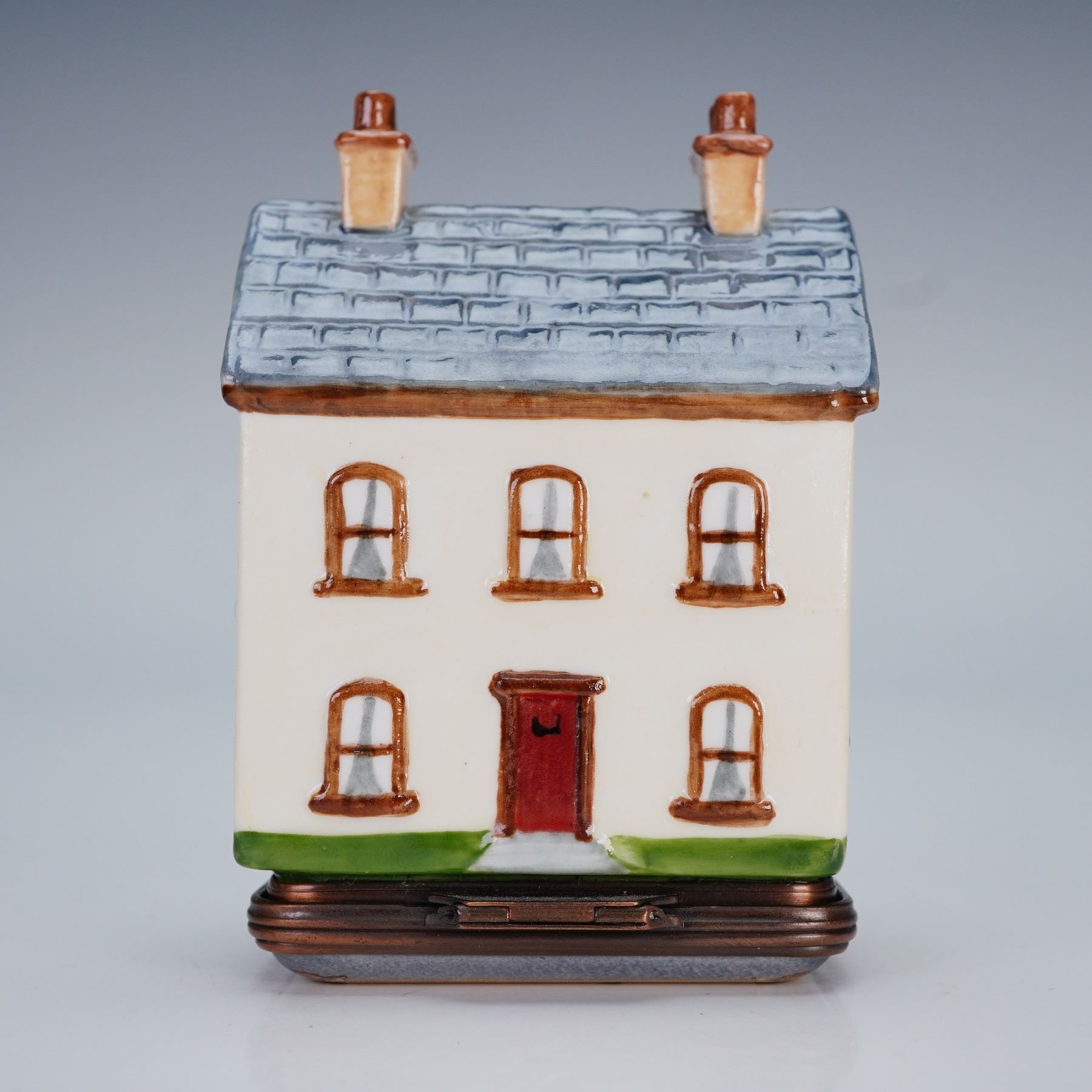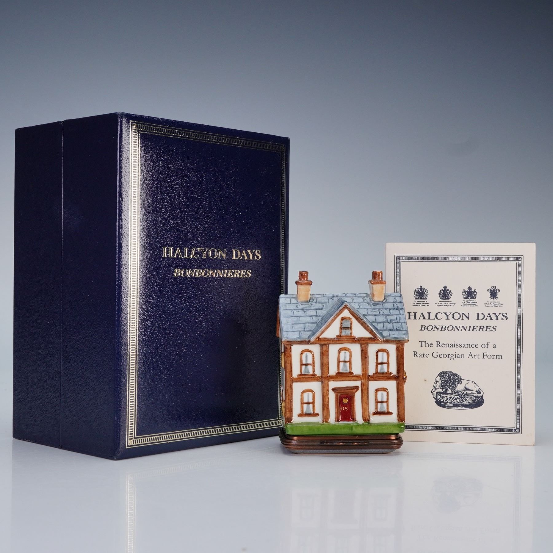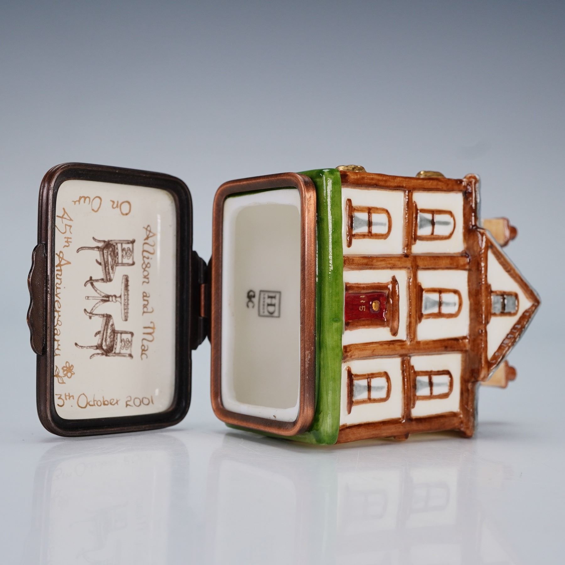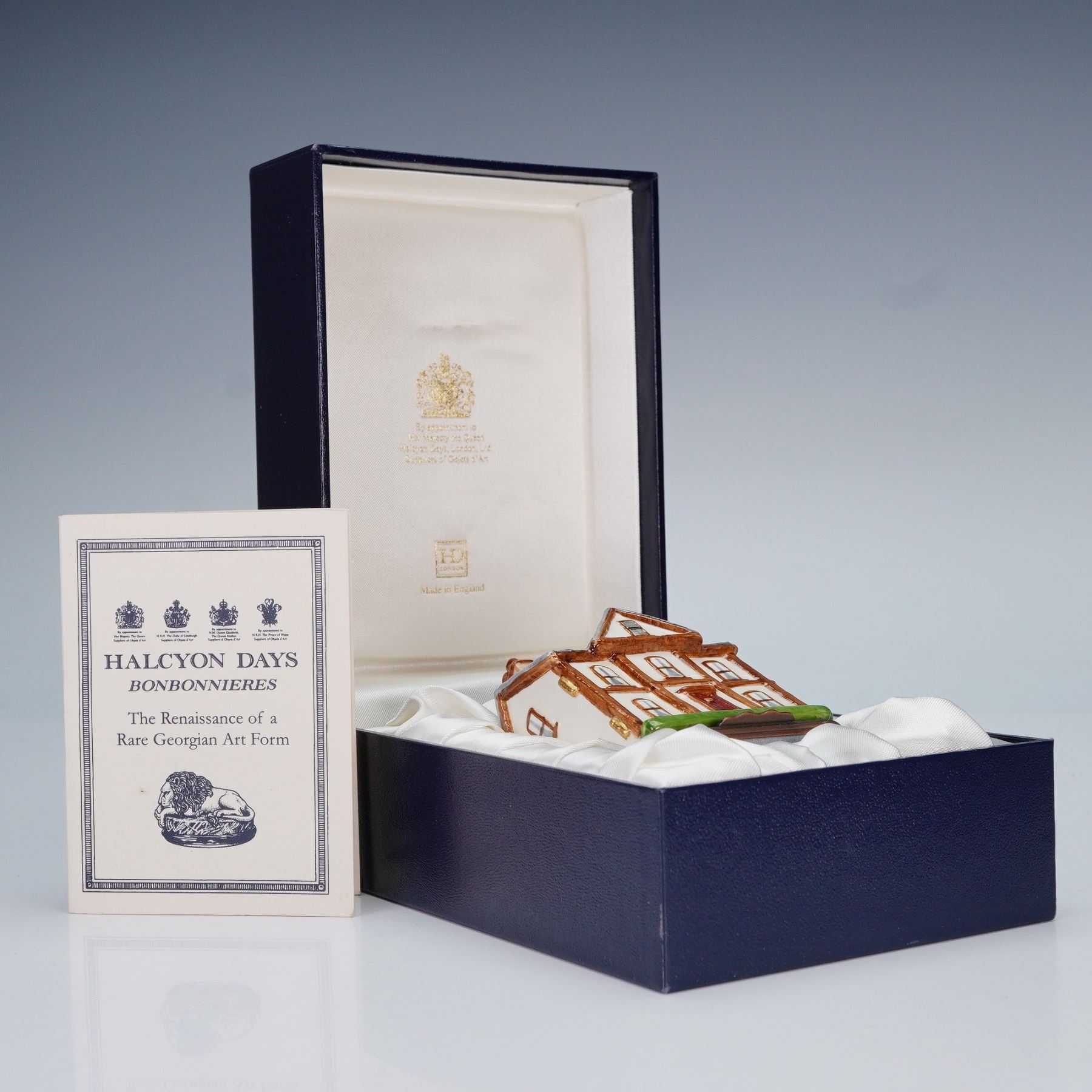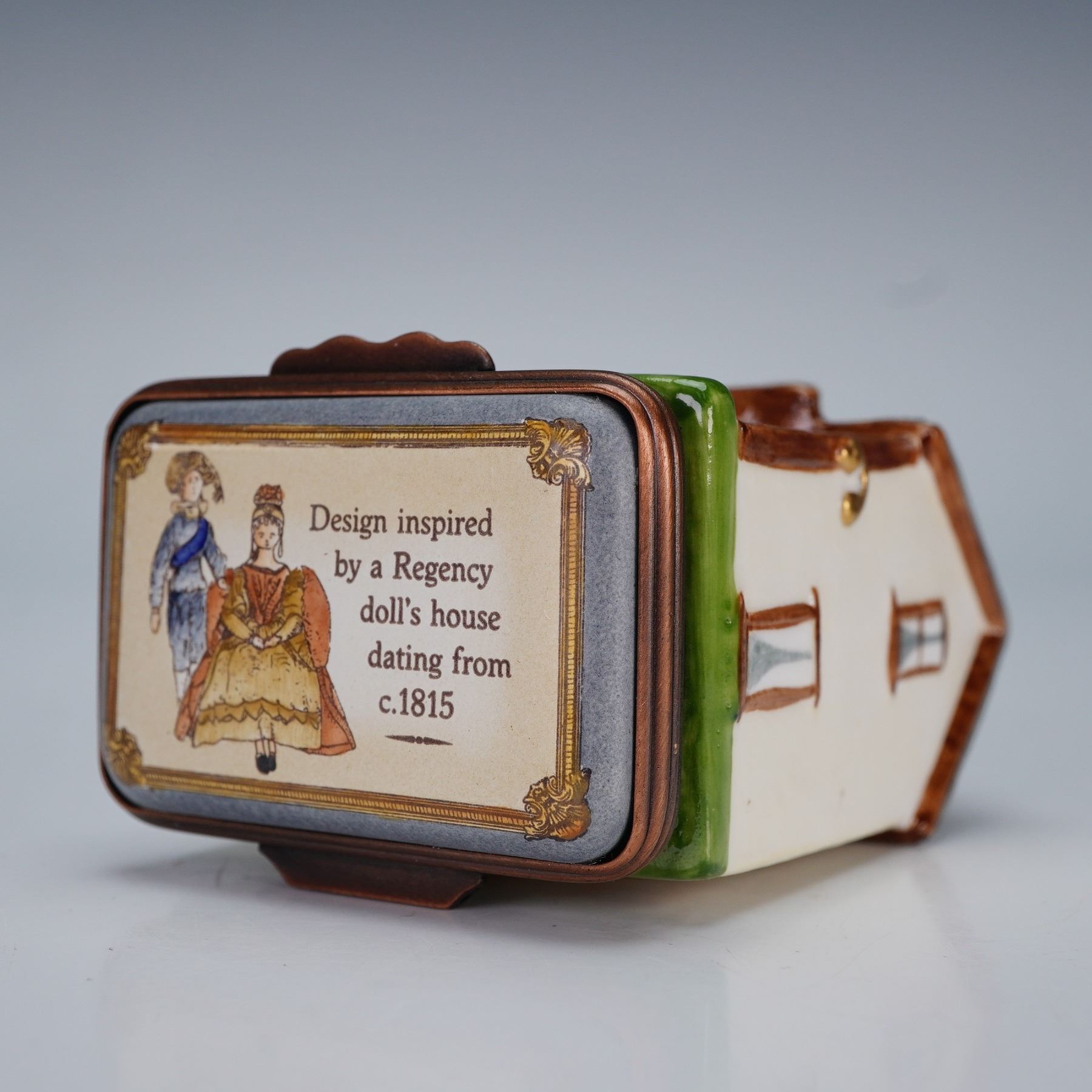 A beautiful enamel bonbonniere fashioned in the form of a Regency-style doll's house, its design inspired by an early nineteenth century example dating from circa 1815. Painted with a white facade, red door, and pitched grey roof with twin chimneys, and it opens to reveal a decorated interior lid inscribed with a commemorative dedication dated 3rd October 2001. Halcyon Days backstamp. This item has its original box.