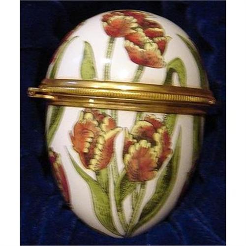 </font></strong>Halcyon Days---the very best of enamelling. This is an egg shaped box by the famous maker, decorated beautifully with tulips. It will come to you in its original box. The egg is 2 3/4" long x 2" wide. </font>