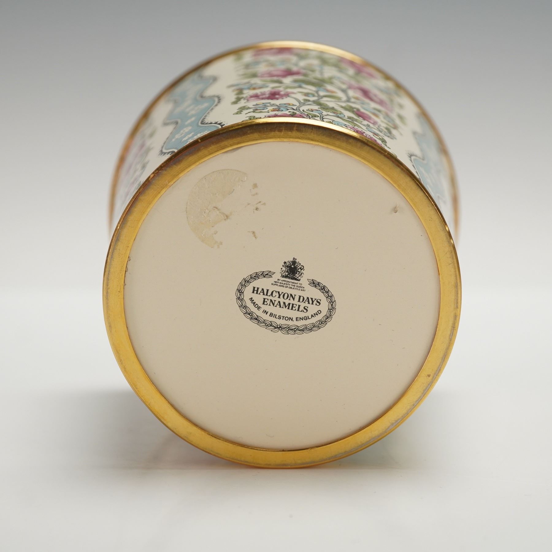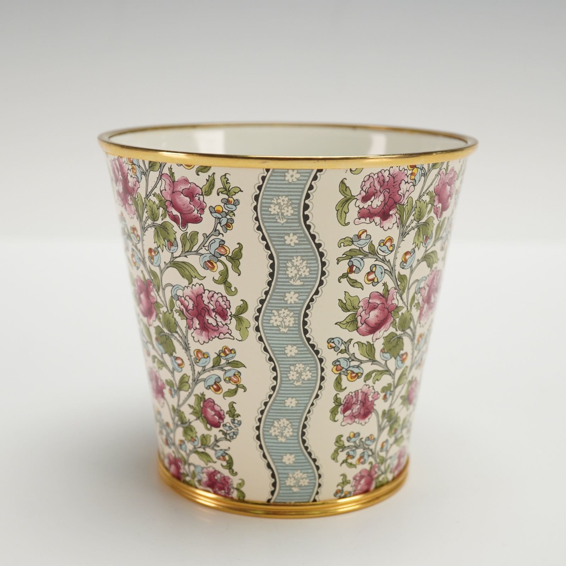 This Halcyon Days enamel pot features a beautiful floral design, with vibrant pink flowers and intricate blue ribbons, accented with gold trim along the rim and base. Produced in Bilston, England, it is a fine example of craftsmanship, showcasing the brand's long tradition of enamelware.