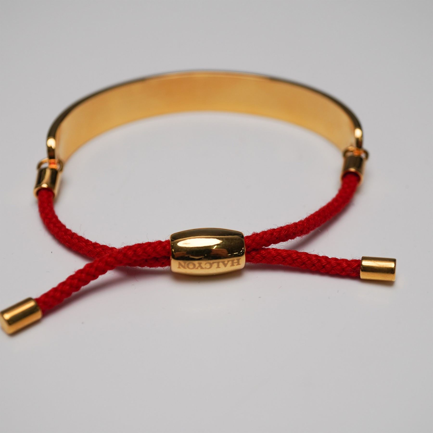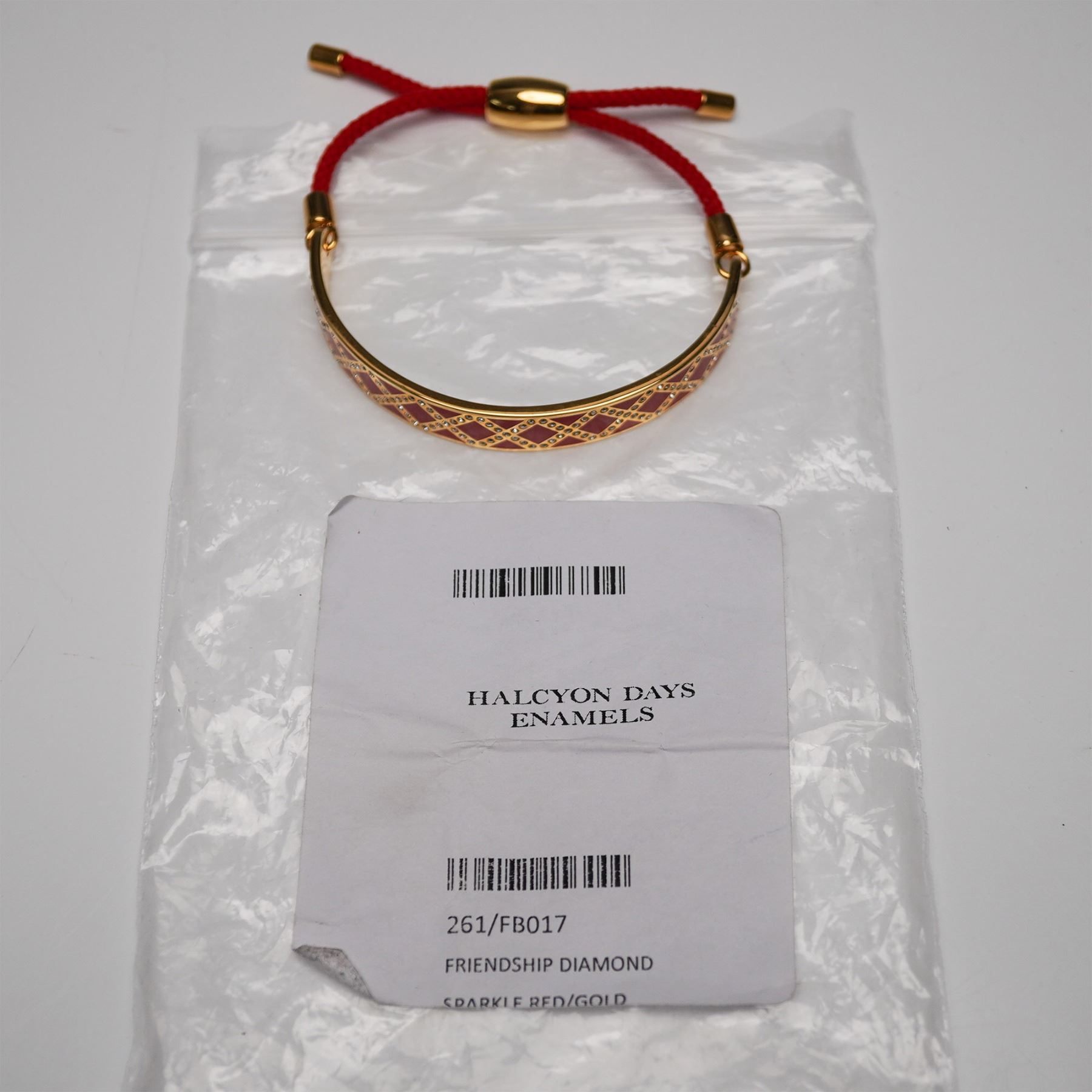 Halcyon Days gold-plated enamel bangle bracelet featuring a red and gold lattice design accented with crystals. The bracelet is crafted with a rigid gold-plated metal band and an adjustable red cord with gold-tone hardware for a secure and customizable fit. The Halcyon branding is engraved on the adjustable slider clasp. A stylish and collectible piece showcasing the brand’s renowned craftsmanship and intricate detailing.