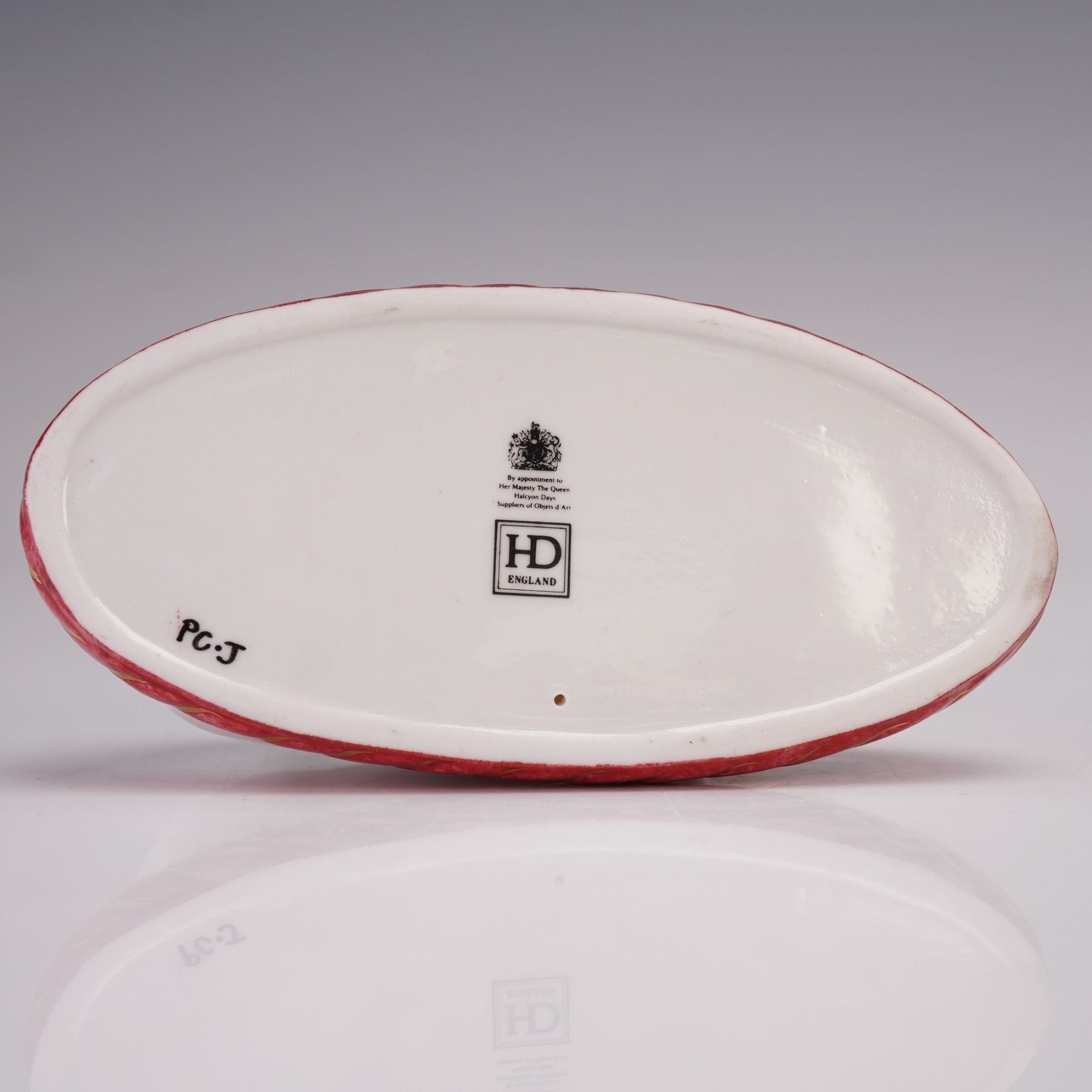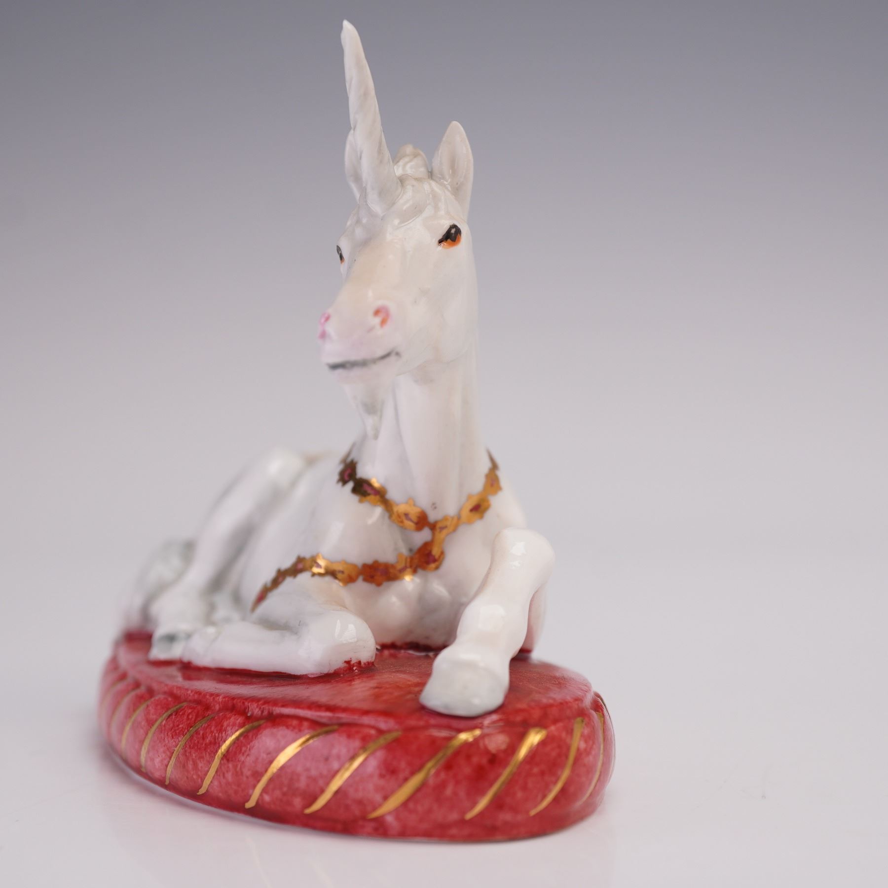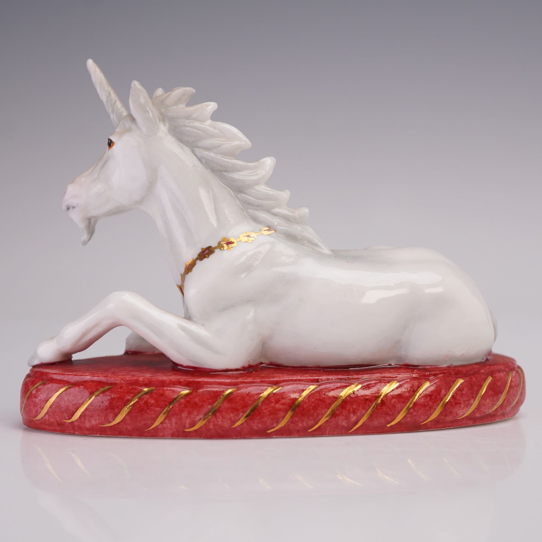 A finely crafted porcelain figurine by Halcyon Days, depicting a reclining unicorn resting on a red oval base with gilt accents. The unicorn is detailed with a flowing mane, spiraled horn, and gilded floral collar, highlighted with delicate hand painted touches. Halcyon Days backstamp.