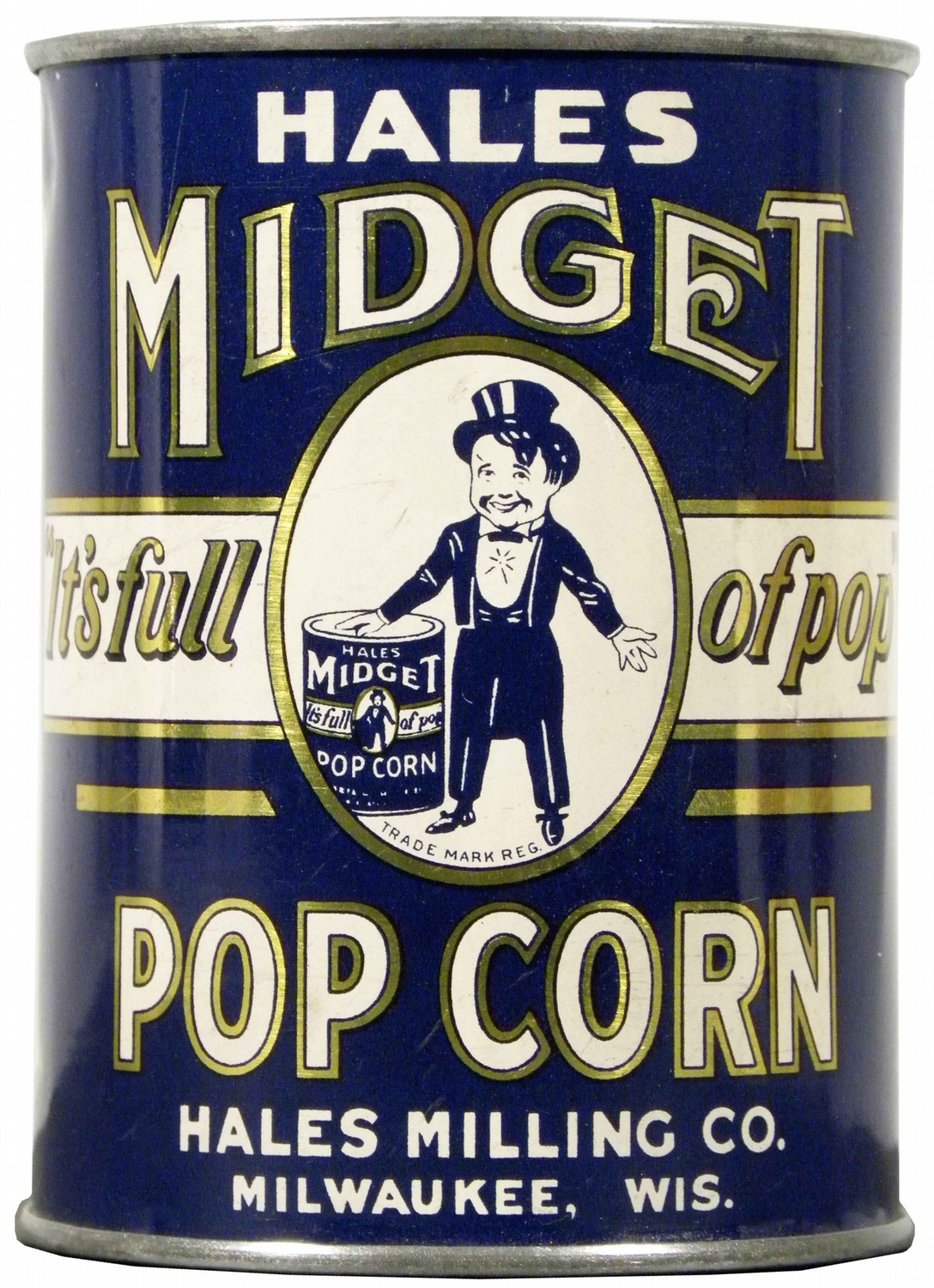 Hales Midget Pop Corn Tin. Hales Milling Co. Milwaukee, WI. 16 0z tin without lid. Near mint condition.