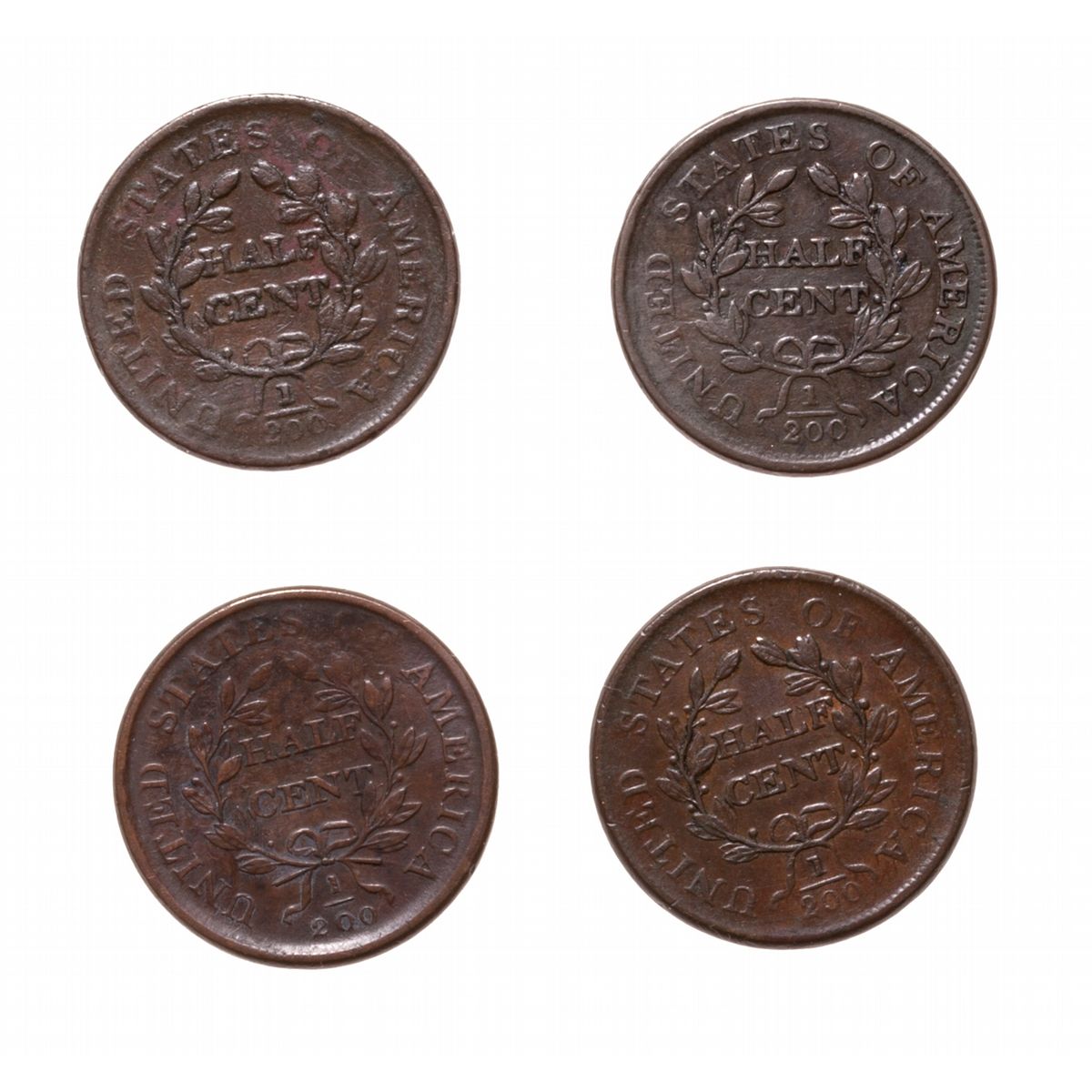 Half Cents. 1804, Plain 4. Stemless wreath; 1806, Large 6, stemless wreath, (2 pcs.). 1808. Total of four (4) half cents, all Fine-12 or better.