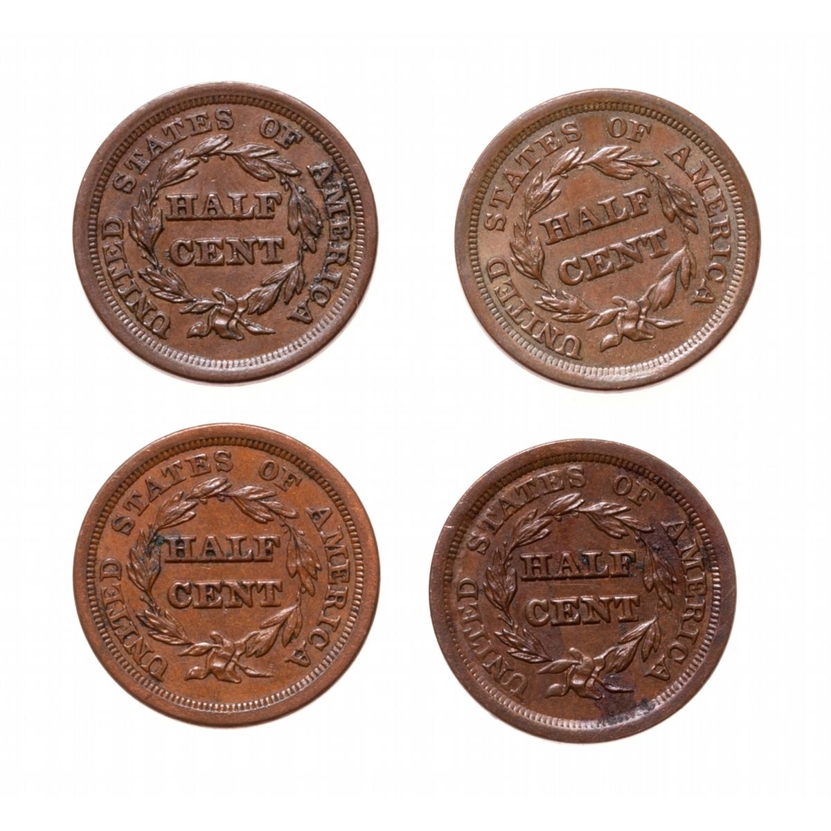 Half Cents. 1850, (2 pcs.); 1854, 1857. Lot of four (4) half cents, all …