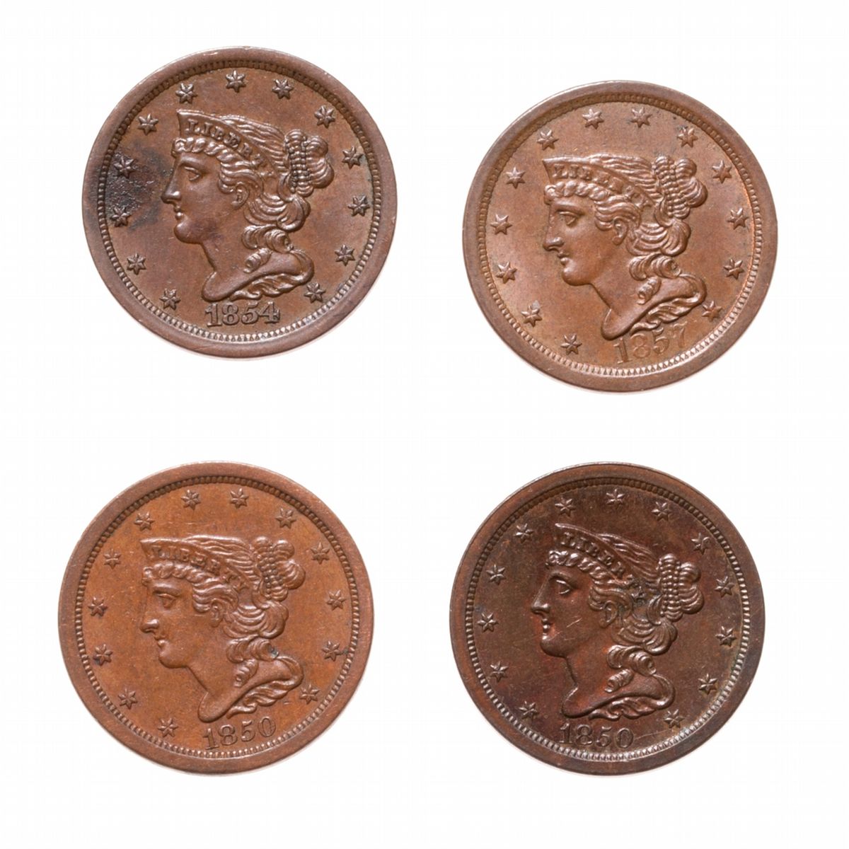 Half Cents. 1850, (2 pcs.); 1854, 1857. Lot of four (4) half cents, all Extra Fine-40 or better.