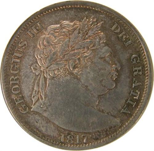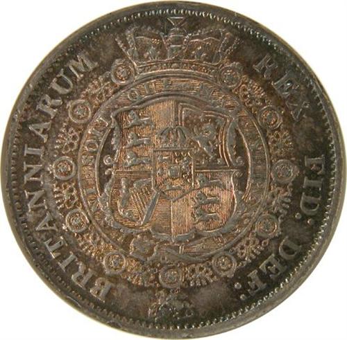 Half Crown 1817 NGC MS-64. A strongly lustrous example with attractive light-medium amber toning with blues and violets at the rims