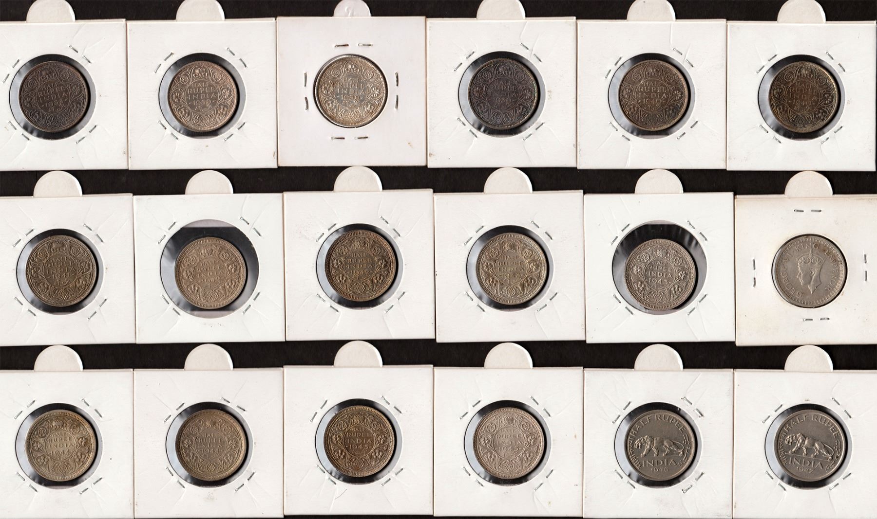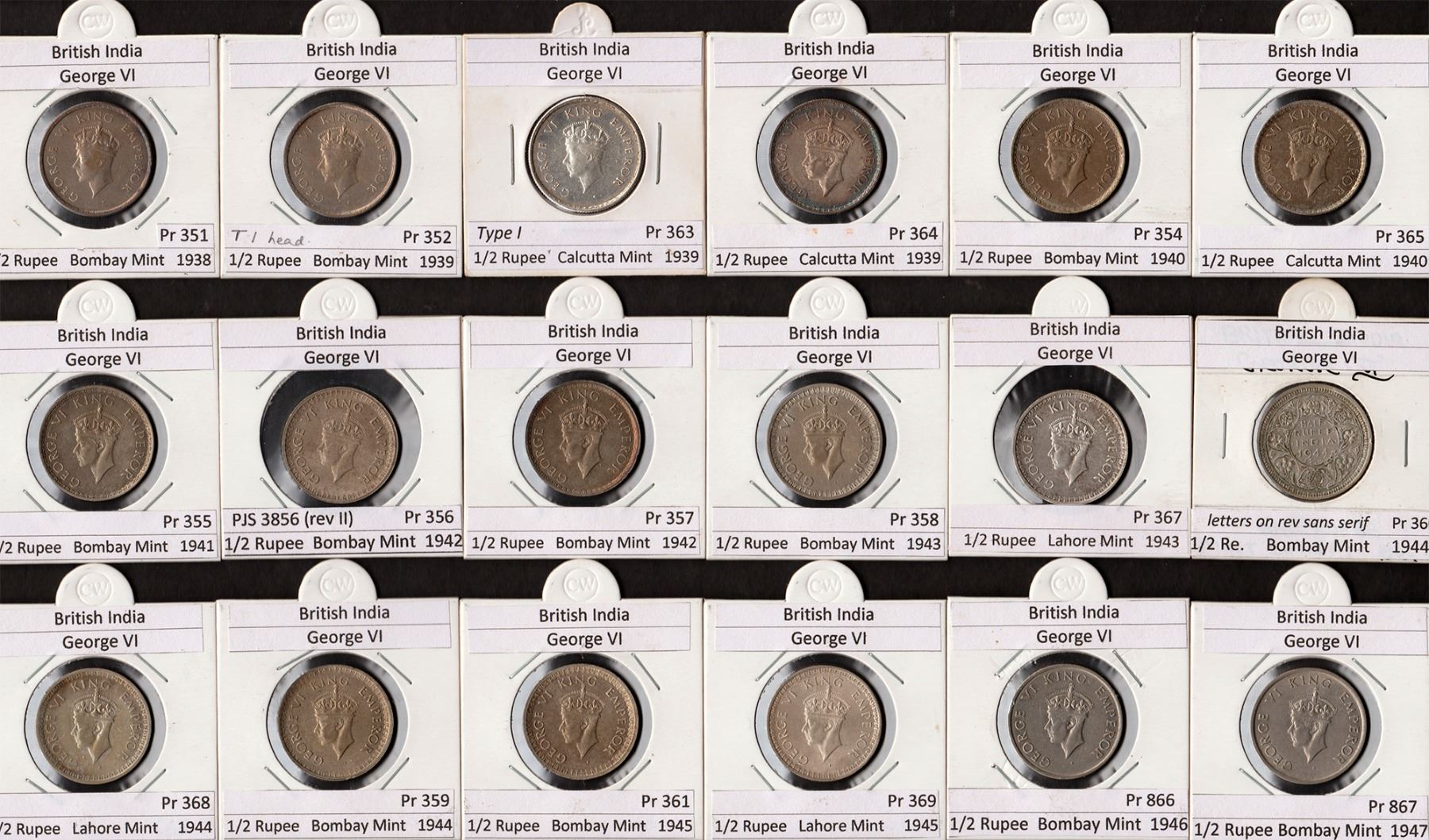 King George VI, Silver & Nickel ½ Rupee (18), Bombay, Calcutta & Lahore Mint, 1938, 1939(3), 1940(2), 1941, 1942(2), 1943(2), 1944(3), 1945(2), 1946, 1947, no dot, dot, diamond & L raised, (PR # 351, 352-363 & 364, 354 & 365, 355, 356 & 357, 358 & 367, 360-368 & 359, 361 & 369, 866, 867/GK # 1294, 1295-1297 & 1298, 1299 & 1300, 1302, 1303 & 1304, 1305 & 1308, 1313-1314 & 1309, 1316 & 1319, 1321, 1322), in some coins ghost image visible & toning, AVF-XF, Rare as a set.