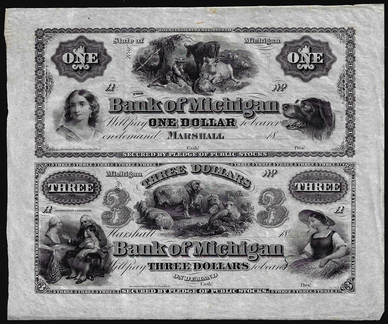 One Half Sheet of 1800's $1 and $3 The Bank of Michigan Marshall, MI Obsolete Notes.