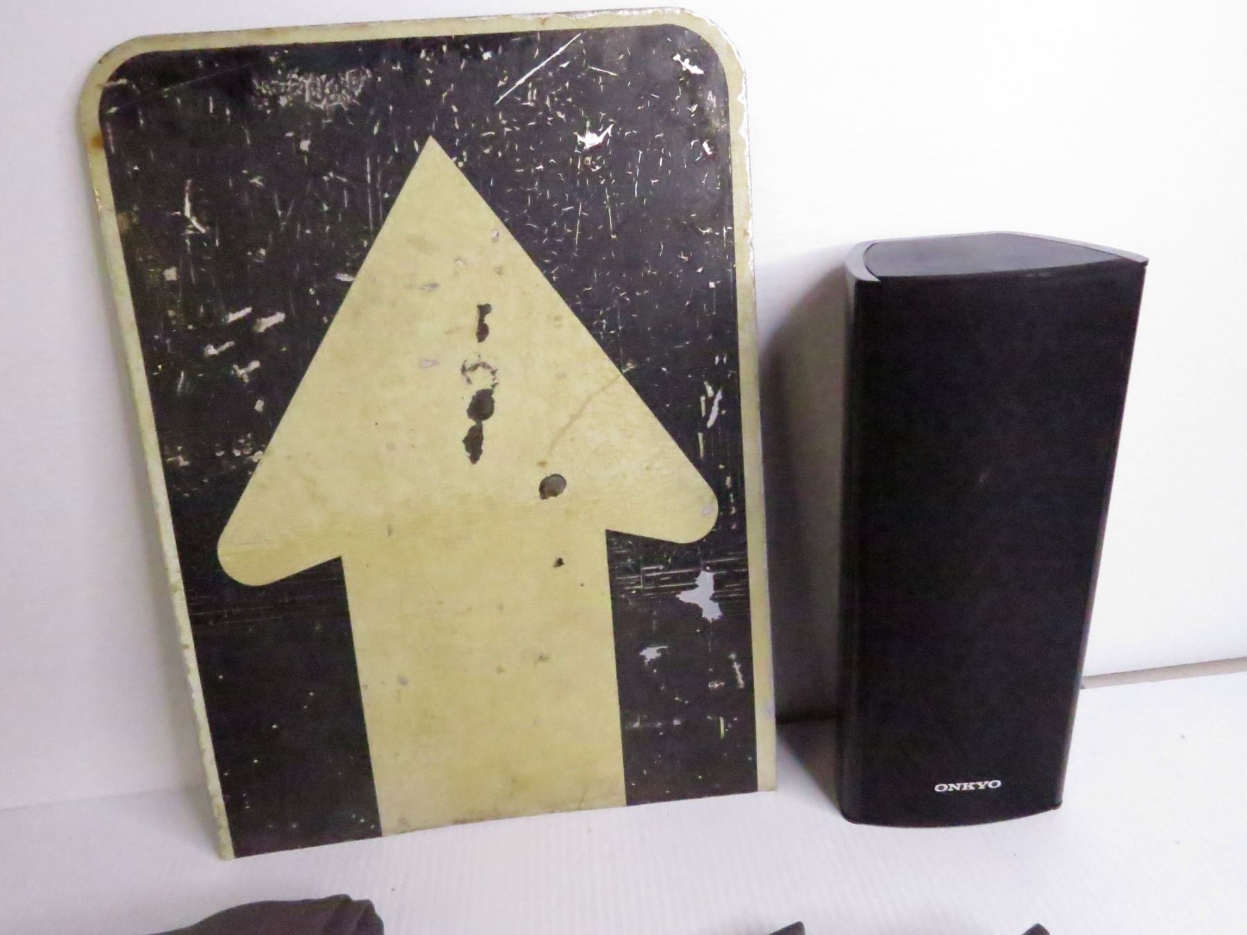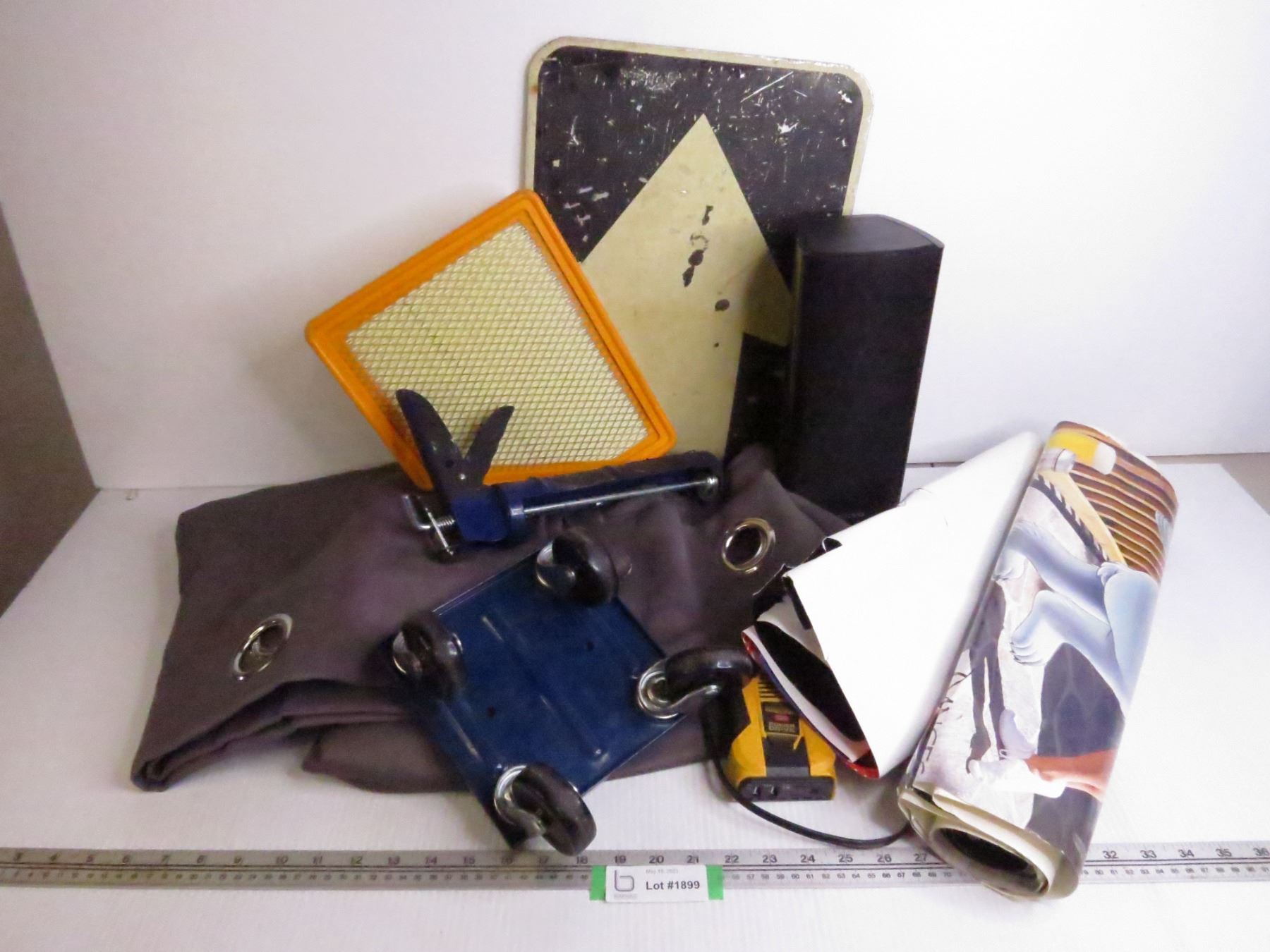 Half of Arrow Direction Sign - Air Filter - Speaker - Caulking Gun - Wheeled Stand - Grey Drapes (sun bleached) - Assorted Beer Posters