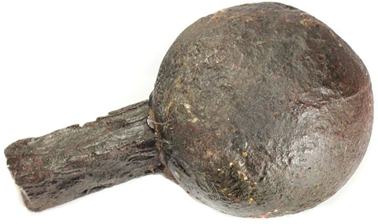 Half of a large iron barshot with one large ball and square-shank bar, probably 1700s. 15 lb, 5" x 8". Heavy and solid ball, with surface corrosion only (one big pit), dark with tinge of orange, with 1-1/4" bar protruding and ending cleanly, so possibly just made as a "half shot" and not broken from a two-ball barshot. Pedigreed to the Henk L. Visser collection (Bonhams Knightsbridge, November 28, 2007).