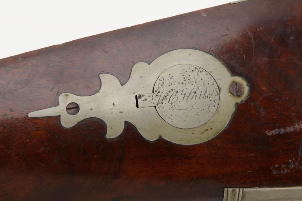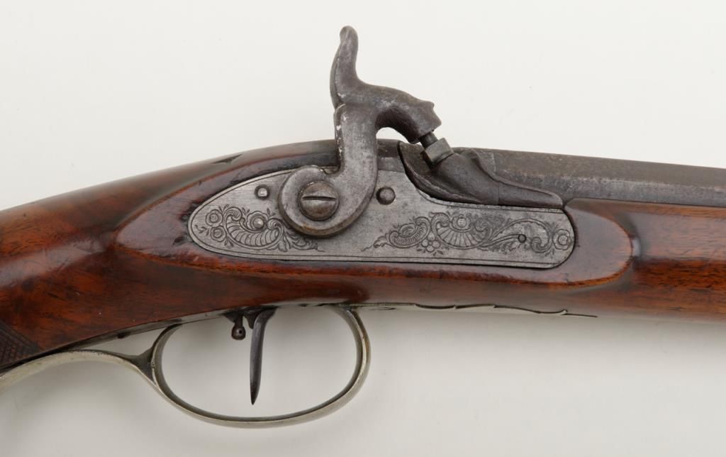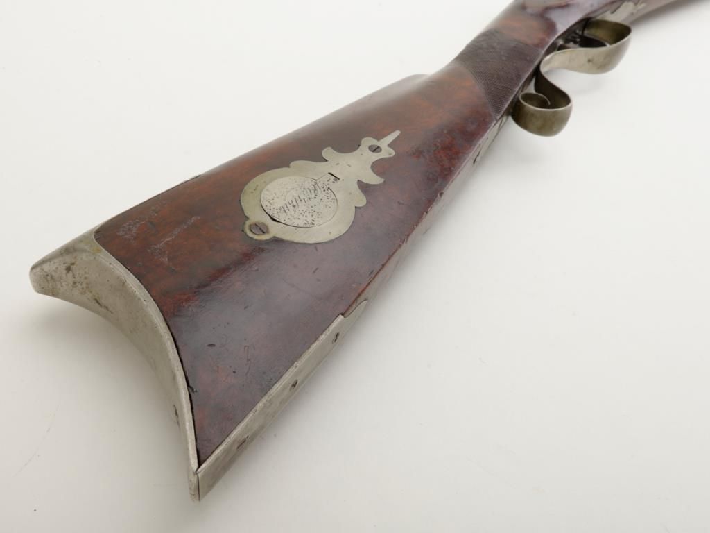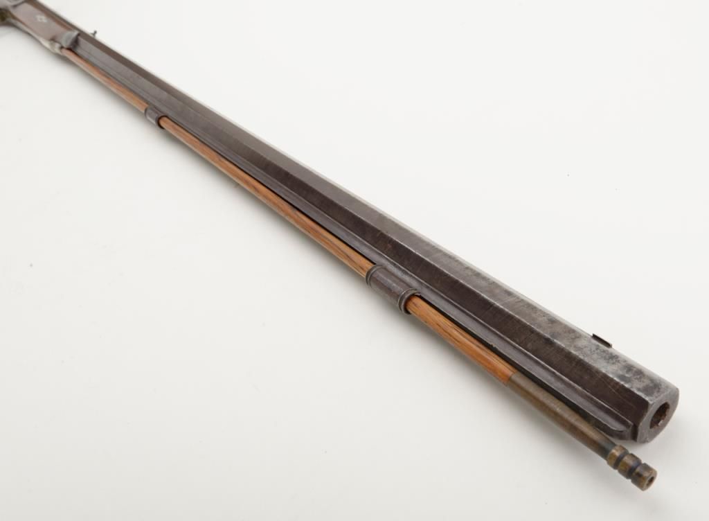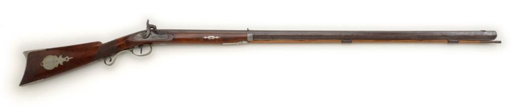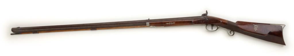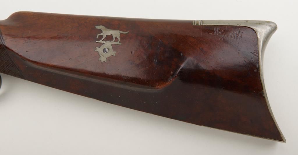 Half stocked American percussion rifle signed on the patch box W.C. White, approx. .40 cal., with 39 5/8" Damascus patterned octagon barrel, 56 1/4" overall. Checkered walnut stock with German silver pointing dog inlaid on left side, and patchbox on right. Rifle remains in very good to fine condition showing some minor freckling and toning. Action is good. There is a slight loss in the silver forend cap. Est. $600-1200. (Antique)