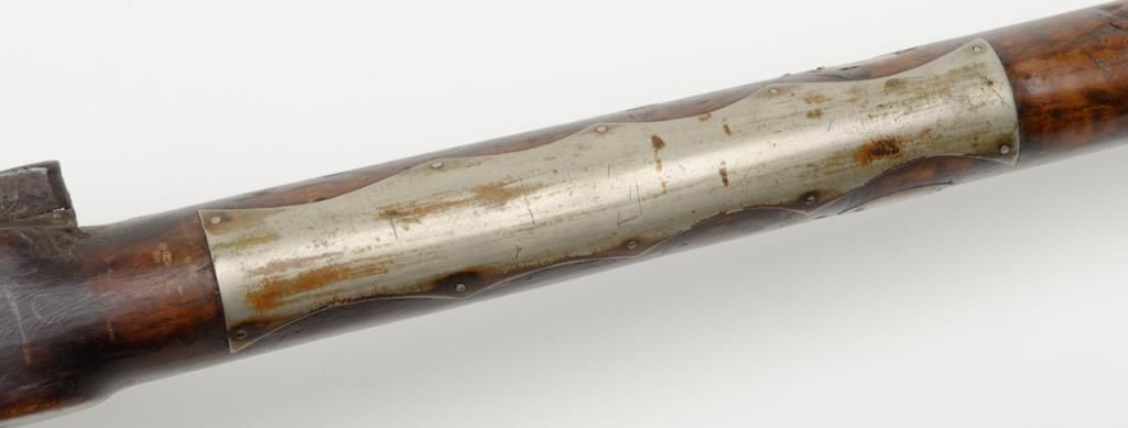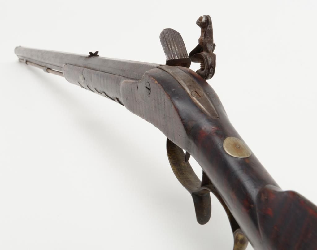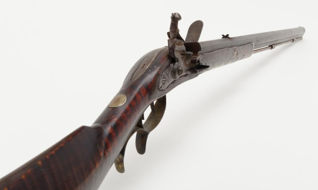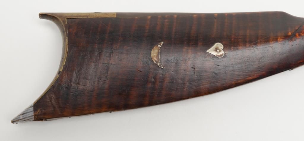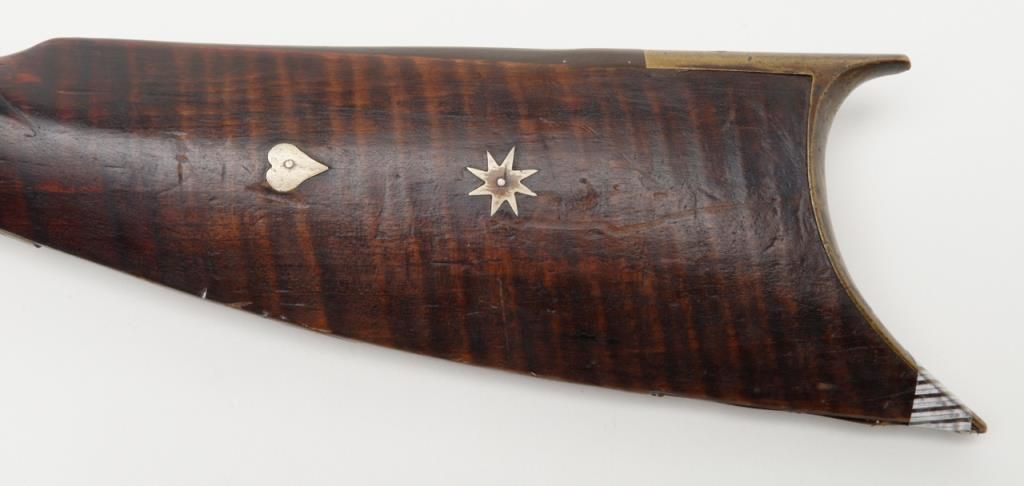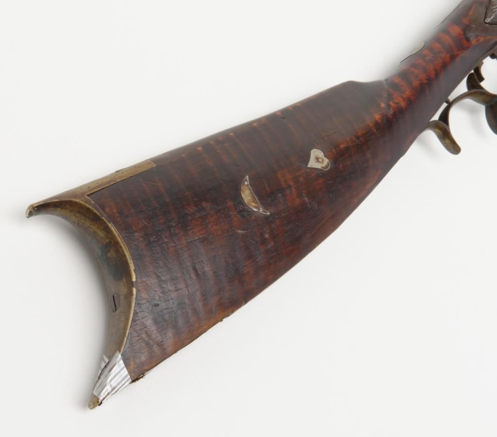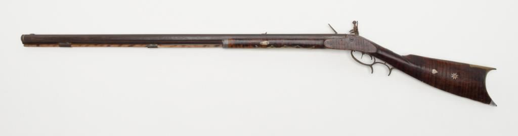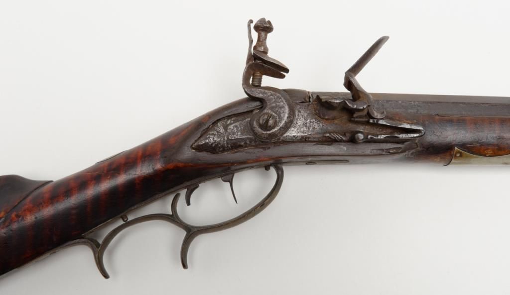 Half stocked flintlock rifle with barrel signed “A. J. Sailous”, .32 cal., 34-1/2” octagon barrel, double set trigger (not working at time of description), tiger striped maple stock, in overall good condition showing a dark patina onmetal surfaces, very early lock mechanism which is not working and in need of service, wood is good with old putty repair around lockplate and on top of butt stock comb; simple inlays on both sides of stock and under the forestock with pewter forendcap; replacement wood ramrod; pierced brass decorative strip at bottom of butt stock has partially separated and needs attention. Overall a nice, early signed American piece. (Antique). Est.: $1,000-$2,000