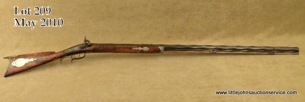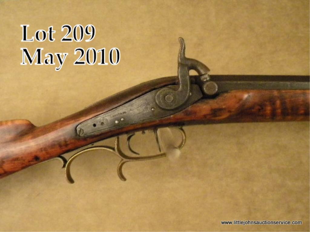 Half stocked percussion plains type rifle, .40 cal., 41” octagon barrel signed “W. C. Woodyard”; back action Leman lock, wood stock with patchbox and brass furniture, pewter forend cap, brass tipped wood ramrod; double set triggers. Thisrifle is in overall good condition showing a dark brown patina on metal surfaces with what appears to be remnants of two additional barrel keys down both sides of the barrel toward the muzzle indicating this rifle may have at one time beenfull stocked; good action with set trigger functioning at time of description; wood stock shows an older refinish and three decorative metal inlays. A nice long barrel plains rifle. Est.: $400-$800.