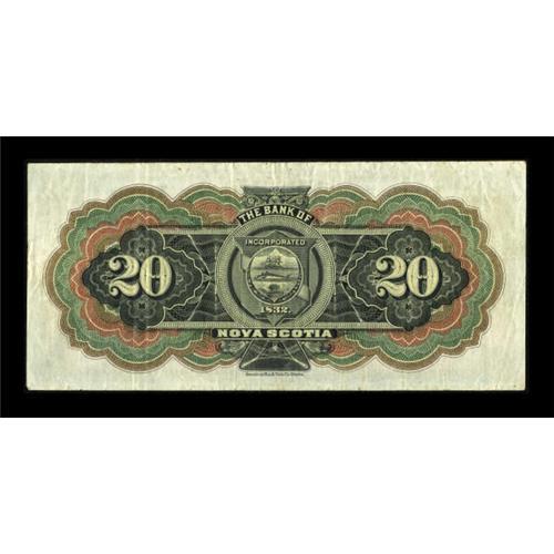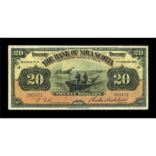 <B>Halifax, NS- The Bank of Nova Scotia</B></I> $20 Feb. 1, 1918 Ch. # 550-28-16<BR> A brightly printed 1918 $20 example. The face design is somewhat modified from the 1903 specimen offered above, while the reverse is identical. <B>Very Fine.</B></I> <BR><I>From The Thomas M. Flynn Collection</B></I><BR><BR><b>Shipping:</b> Coins & Currency (<a target="_blank" href="http://www.heritageauctions.com/common/shipping.php">view shipping information</a>)