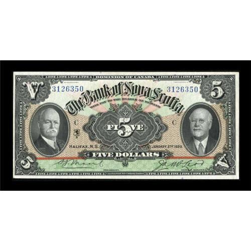 <B>Halifax, NS- The Bank of Nova Scotia</B></I> $5 Jan. 2, 1929 Ch. # 550-34-02<BR> A high grade specimen from the last large size issue from this bank. <B>About Uncirculated.</B></I><BR><I>From The Thomas M. Flynn Collection</B></I><BR><BR><b>Shipping:</b> Coins & Currency (<a target="_blank" href="http://www.heritageauctions.com/common/shipping.php">view shipping information</a>)