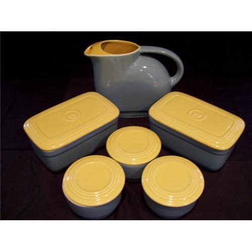 Rare set of Hall Earthenware refrigerator pieces from 1952. Hall made this line exclusively for Westinghouse Refrigerators. The colors are Turk Blue/Daffodil. The "Adonis" set includes: (2) rectangle 6 1/2" by 4" containers, (3) 3 1/2" round containers, and The water pitcher that measures 7" tall by 8" wide. All are printed; "Made Exclusively For Westinghouse By The Hall China Co. Made In USA" on the bottoms. The set is in "Like New" Condition. No chips, cracks, or crazing. Wonderful find!