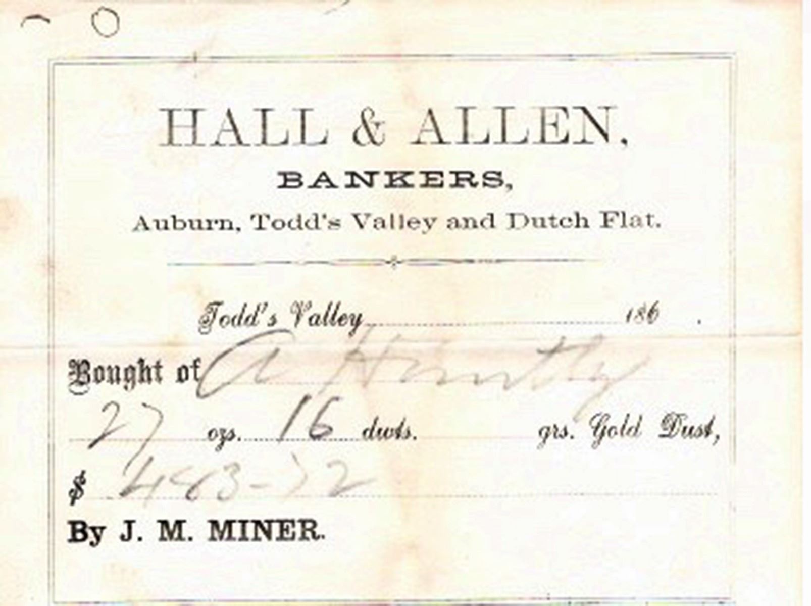 Todd Valley, CA, Placer County - c1867 - Hall & Allen, Bankers, Gold Dust Receipt - Gold dust receipt for gold purchased by J.M. Miner, an agent for Hall and Allen Bankers at Todd's Valley. Hall and Allen also had bank branches at Auburn and Dutch Flat as noted on the certificate. Todd's Valley was named for F.W. Todd, a cousin of Mary Todd Lincoln, who opened a store there in 1849. The U.S. Post Office there opened in the mid 1850s, and the area remained a rich gold producer through at least the 1880Ìs, having produced millions of dollars in gold. This receipt is for 27 plus ounces of gold valued at $483.72. Fine with rubber band stains on reverse. Size: 5.125 x 3.375 inches. Todd Valley California 1867