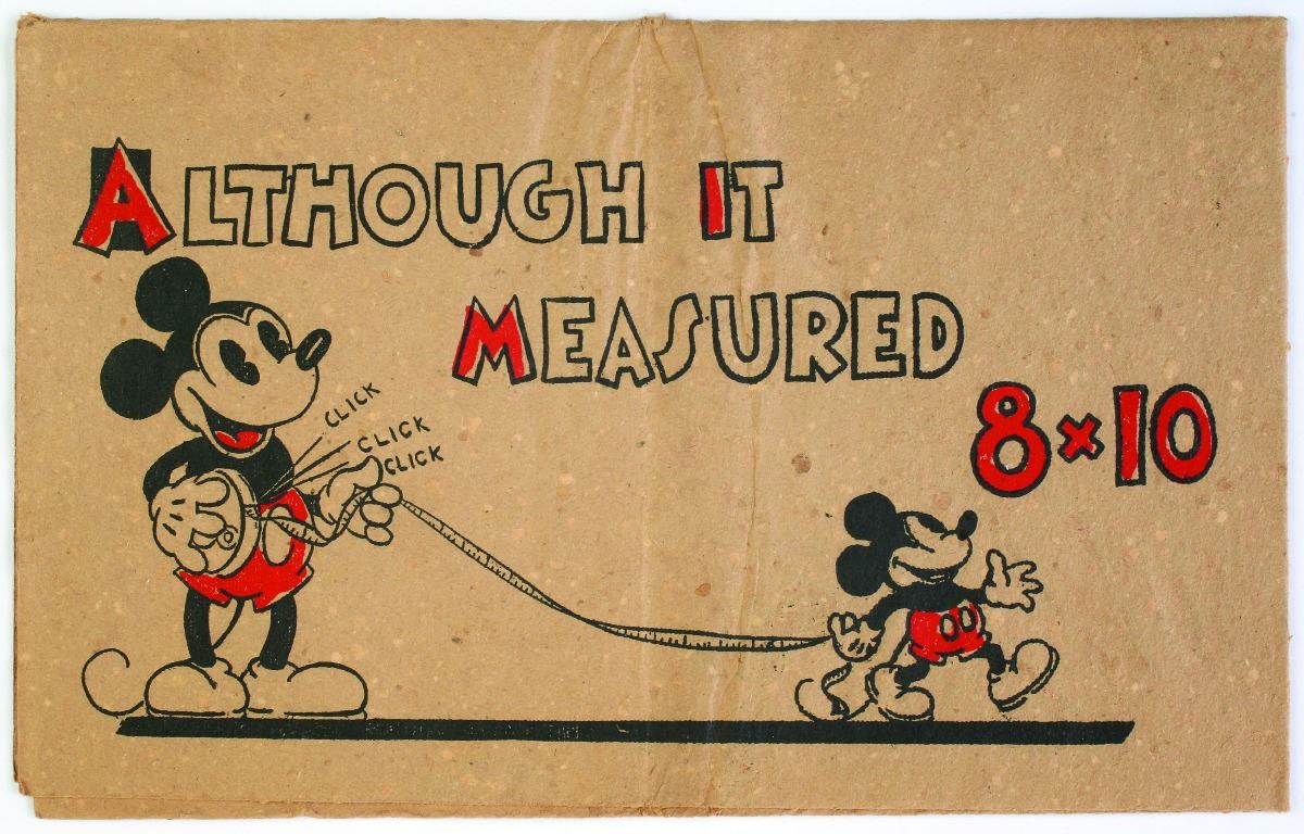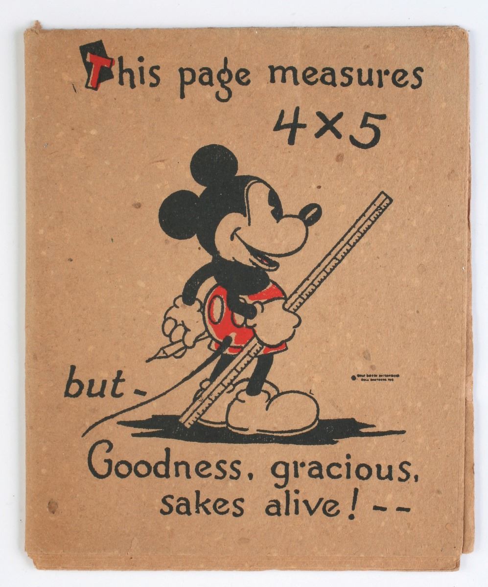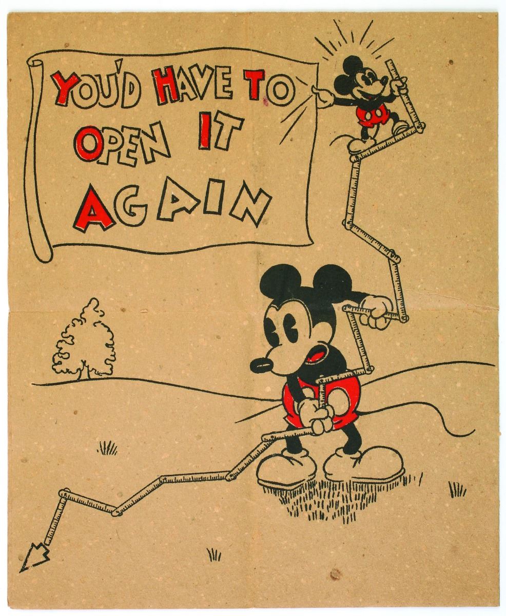 (Hall Brothers, c. 1931) Rare early Mickey Mouse Birthday Card produced by Hall Brothers. The 5.75"x4.75" folded card unfolds to a very large 18.5"x22.5" birthday greeting. In good condition with a few small tears in the fold creases and some specks of discoloration.