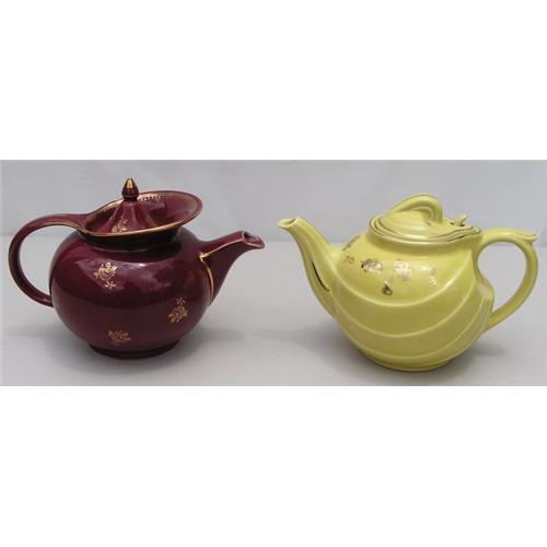 Just the thing to brighten your day, a nice cup of tea out of your beautiful Hall teapot. First is a 6-cup Parade Teapot in bright yellow with gold trim and a gold leaf and acorn design. This piece is in near perfect condition. There is one tiny chip on the end of the spout. It is hard to see, but it is there. The gold shows almost no wear except at the very top of the handle. There are no cracks or repairs anywhere on this wonderful item.