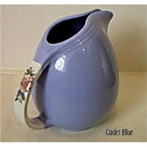 Nostalgic Hall Superior Kitchen Tested 8 inch Rose Parade pinched spout water jug in Cadet Blue.<BR><BR>Contrasting Hi-White handle with the original single bloom Rose Parade transfer pattern. Structurally it is rated to be in excellent condition, however there is a section under the rim (indicated in photo) where the base cream color has bled through during manufacturing. I would not classify it as a glaze slip. Bleeds nicely and is not stark in contrast, however we have priced accordingly to reflect this manufacturer's flaw.<BR><BR>