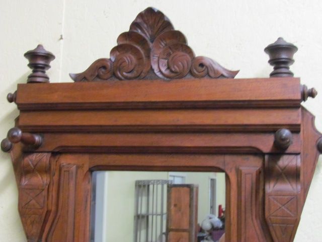 19th Century Victorian single Hall Tree, carved crest, original hat holder and umbrella /cane holder over single drawer in center 85" tall