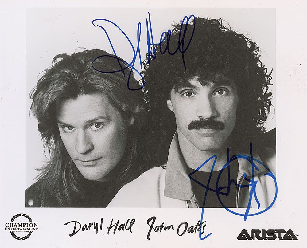Glossy 10 x 8 Arista publicity photo, signed in person in blue felt tip by Darryl Hall and John Oates. In fine condition. Originally obtained by in-person specialist Mike Wehrmann.
