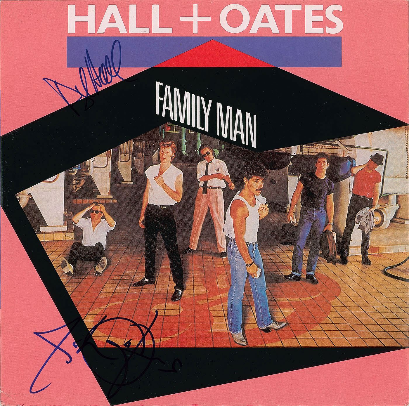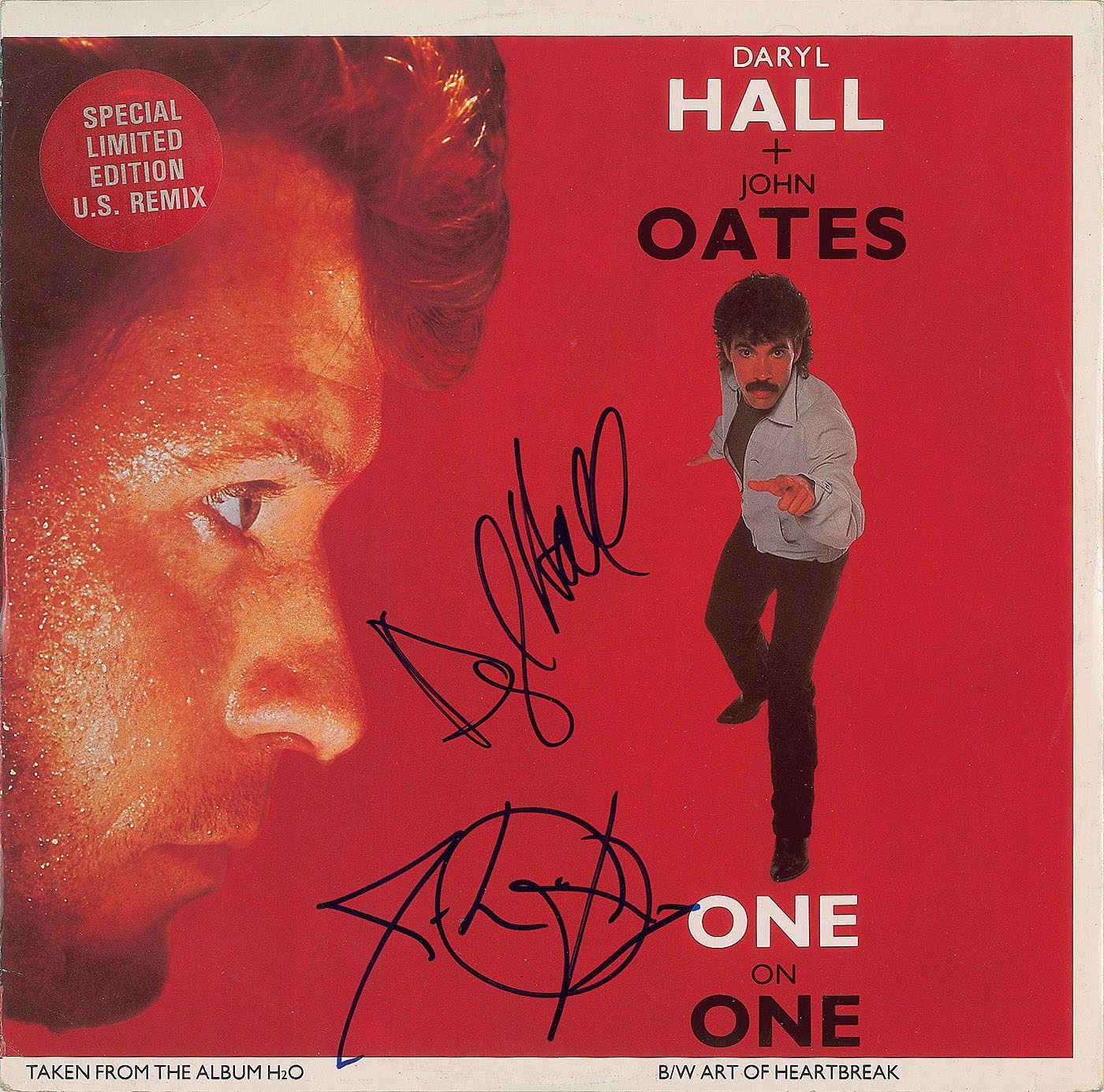 Two single albums signed on the front cover in blue felt tip by Darryl Hall and John Oates: Family Man and One on One. In overall fine condition. The records are included.