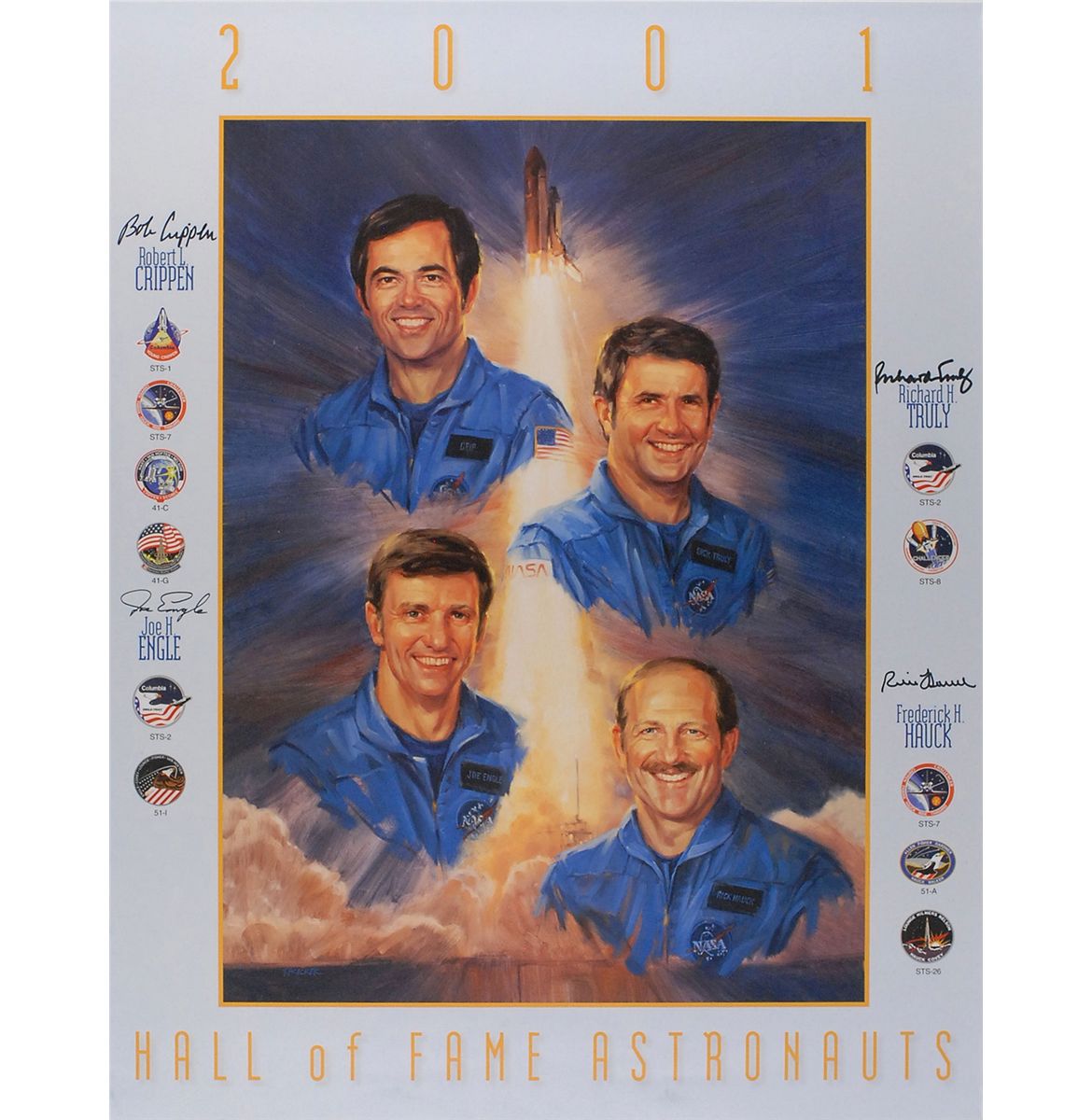 Color 22 x 28 print of the 2001 inductees into the Astronaut Hall of Fame, signed in black felt tip by Bob Crippen, Joe Engle, Richard Truly, and Fred Hauck. Rolled and in fine condition, with a few scattered light creases and edge dings.