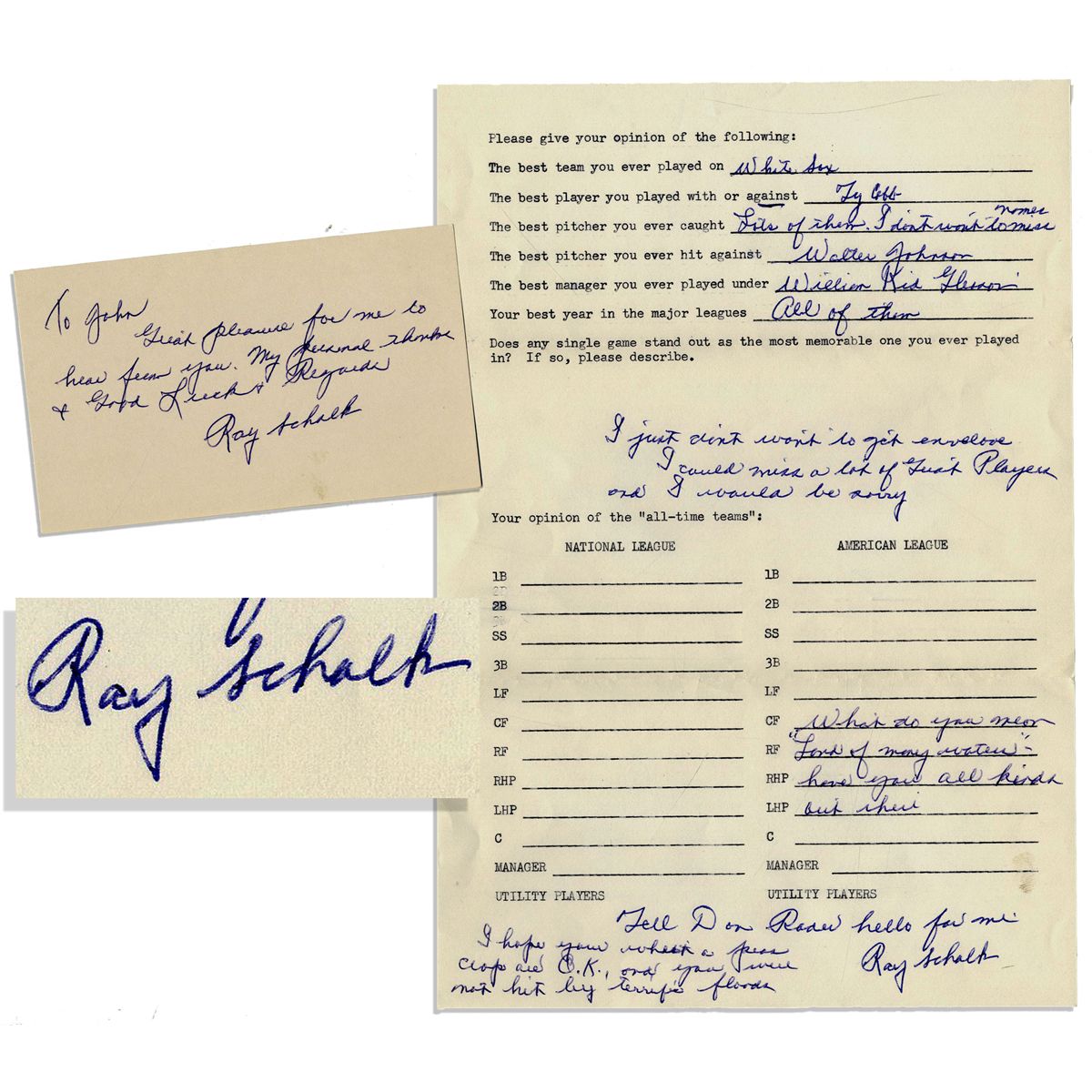 White Sox Hall of Famer Ray Schalk bold, clear signature and handwritten responses to a typed questionnaire of a fan, who lists a variety of questions pertaining to his career. When asked who the best player he played with or against was, Schalk writes: ''Ty Cobb''. When asked his best year in the major leagues, he writes: ''all of them''. At bottom, Schalk signs the questionnaire, ''Tell Don Rader hello for me / Ray Schalk''. Questionnaire measures 7.25'' x 10.5'' on one page with two folds from mailing, else fine. Includes original 1965 postmarked envelope. Lot also includes a small autograph note signed in Schalk's hand. Schalk writes: ''To John / Great pleasure for me to hear from you. My personal thanks & Good Luck & Regards / Ray Schalk''. Measures 5'' x 3''. Near fine.