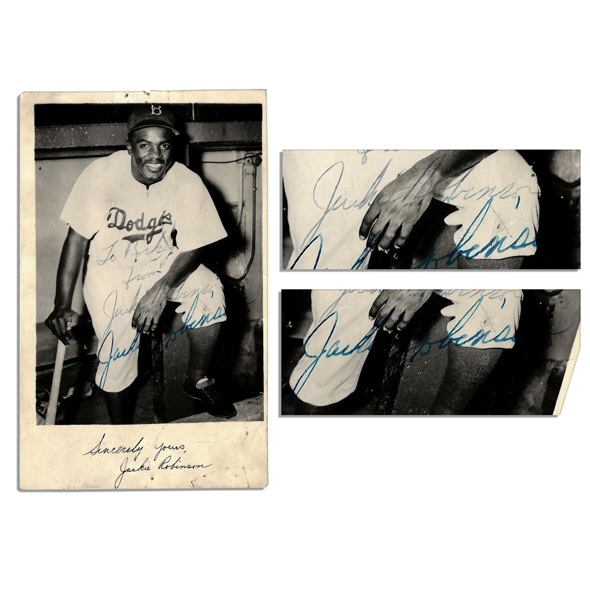 Spectacular Jackie Robinson twice-signed photo postcard, depicting the legendary player in his Dodgers uniform. Inscribed and signed in blue pen: ''To Rocky, From Jackie Robinson'' and then additionally signed underneath in darker green pen, ''Jackie Robinson''. 3.25'' x 5.5'' photo also has a printed signature on the border underneath photo. Three pin holes and minor tape residue in spots, overall in very good condition. Includes original envelope to the recipient, postmarked 25 August 1957. With PSA/DNA COA for both signatures.