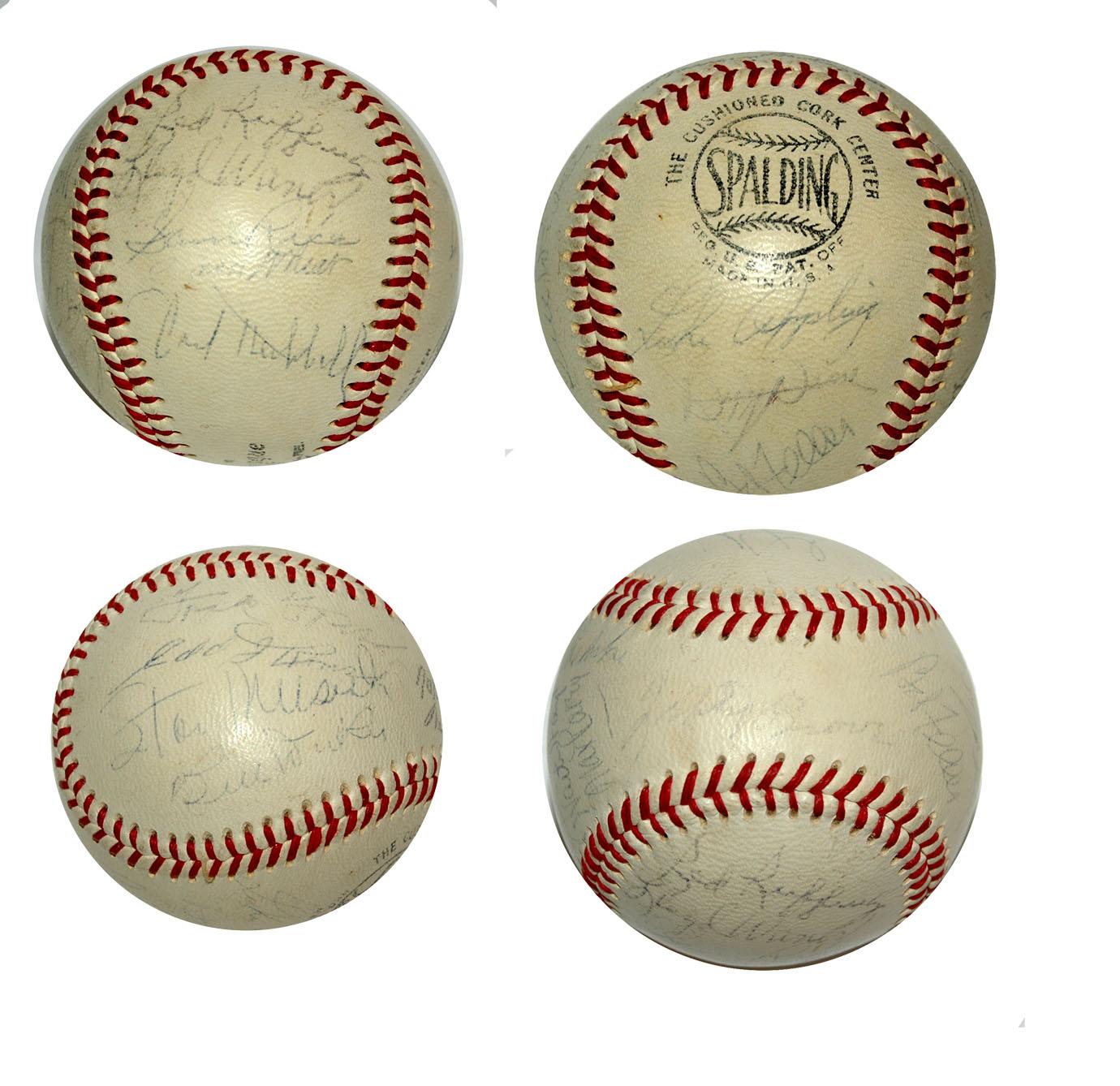 Official National League Baseball signed by 19 Hall of Famers. Signatures include: Luke Appling, Bob Feller, Dizzy Dean, Lefty Grove, Frank Frisch, Edd Roush, Stan Musial, Bill Dickey, Casey Stengal, Pie Traynor, Joe DiMaggio, Waite Hoyt, Max Carey, Stan Coveleski, Red Ruffing, Lloyd Waner, Sam Rice, Zack Wheat and Carl Hubbell. All signatures legible though some show fading. A one-of-a-kind signed ball in very good condition.