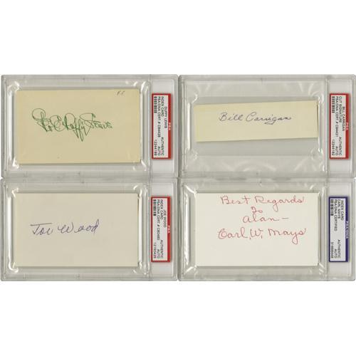 <B>Hall of Famer & Stars Signed Index Cards Lot of 8.</B></I> Top quality ink from top quality names. All autographs appear on the blank side of 3x5" index cards unless otherwise noted, and are encapsulated by PSA/DNA. Manush, Traynor, Yawkey, Hafey, Carl Mays (personalized), Joe Wood, Duffy Lewis, Bill Carrigan (cut signature). All are 9/10 or better. An appealing lot for collectors and dealers alike. <I>LOA from James Spence Authentication. LOA from PSA/DNA.</B></I><BR><BR><b>Shipping:</b> Sportscard (<a target="_blank" href="http://www.heritageauctions.com/common/shipping.php">view shipping information</a>)