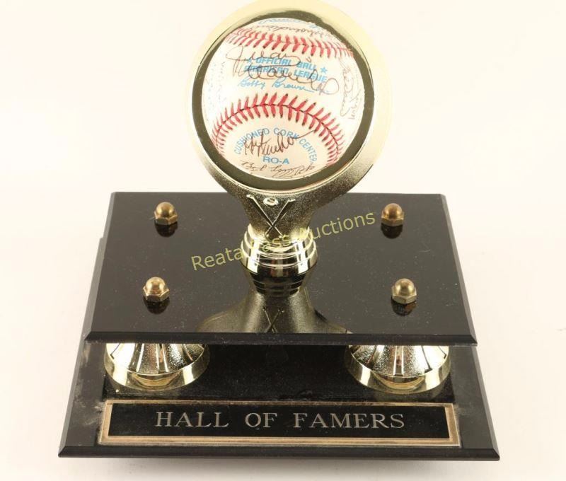 'Rawlings Official Ball American League, Bobby Brown, Cusioned Cork Center, RO-A' baseball in black and gold 'Hall of Famers' display case with plexiglass top. Measures 7 3/4"x8"x7". Item is as is as we are not signature or sports memborbilla experts.