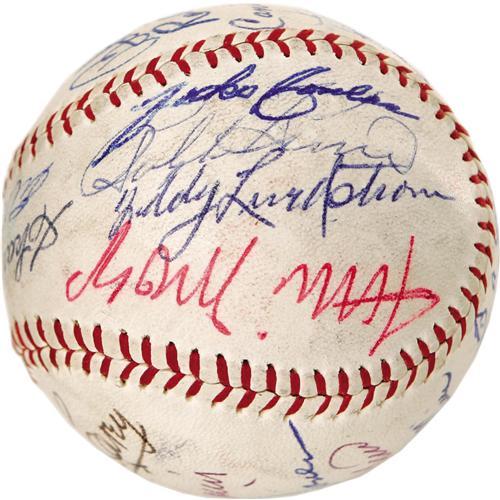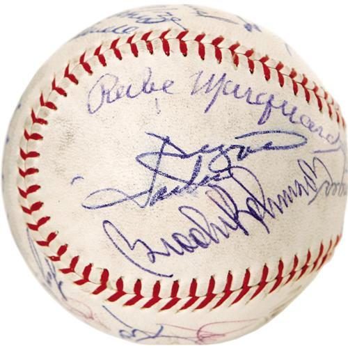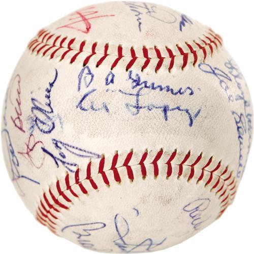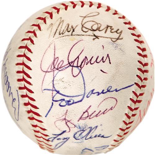<B>1970's Hall of Famers Multi-Signed Baseball.</B></I> Quite a few legends of the game who once held this sphere in their hands have sadly passed since applying their 9/10 and better autographs, leaving behind an irreplaceable keepsake that gleams with Cooperstown quality. Sharing space in the Hall are Marquard, Reggie Jackson, Brooks Robinson, Gehringer, Mathews, Mays, Lindstrom, Kiner, Conlan, Feller, Roberts, Mize, Lloyd Waner, Sewell, Grimes, Lopez, Berra, Carew, Cronin and Carey. That's twenty Hall of Famers! Pascual and Oliva are the only non-inductees here. The stamping of the ball was eliminated with a nail file to provide more space for autographs, but it appears to be an Official model. And there's still room for a few more to sneak in, so don't forget to take this ball along to the next big autograph show. <I>LOA from PSA/DNA.</B></I>