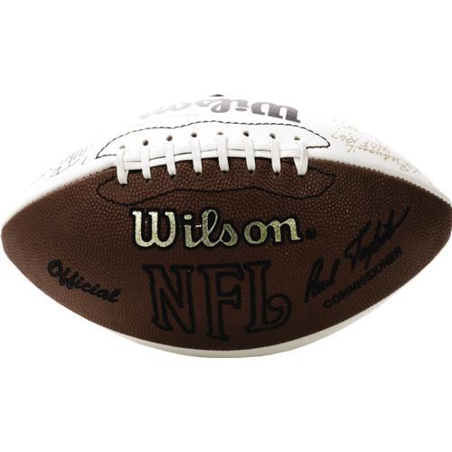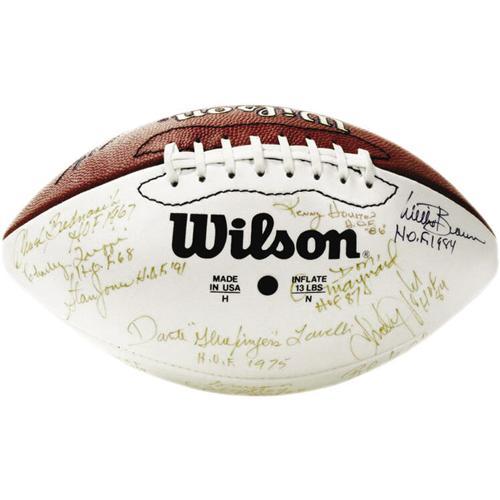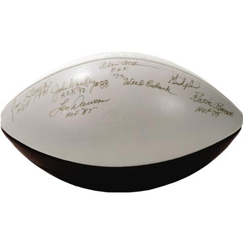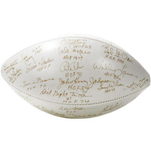 <B>Hall of Famers Multi-Signed Football.</B></I> A labor of love for a football fan and autograph collector who toted this Official NFL white paneled pigskin to dozens of signing events to collect twenty-nine perfect black ink signatures from the greatest gridiron legends. All but two have added the year of their inductions to their autographs. Present are: Bednarik, Trippi, Stan Jones, Lavelli, Houston, Willie Brown, Maynard, Charley Taylor, Kelly, Parker, Perry, Stautner, Fears, Motley, Sayers, Pihos, John Henry Johnson, Lane, St. Clair, Lanier, Larry Wilson, Renfro, Stenerud, Mackey, Dawson, Matson, Rosie Brown, Eubank and Upshaw. Now it's up to you to go get the rest. Any Canton resident would be pleased and honored to add his name to this fine piece. <I>LOA from PSA/DNA.</B></I> <BR><BR><B>Important notice:</B> Heritage usually auctions material at the rate of 200-250 lots per hour. On some occasions eBay Live bid software or the Internet may not be able to keep up with the pace of the auction. We recommend placing a realistic absentee bid now as insurance to avoid disappointment. Occasionally the auctioneer may eliminate or reject an eBay Live bid, and the auctioneer may also reopen a lot after the close of the eBay live bidding (usually because we missed an audience bid), and may reject your bid even if it shows you as the winning bidder. By bidding via eBay Live, you agree that Heritage may award the lot to another bidder at its sole discretion under the circumstances described above or any other reasonable circumstances. Since eBay bids are not shown to us until we open the lot on the floor, we treat those bids just like floor bids. In most cases the floor responds before the eBay bid is presented to us, due to Internet lag time, so for consistency we have made it a policy that floor bids are always considered first over tie eBay live bids. Also please note that all Heritage lots purchased through eBay Live carry a 22.5% Buyer's Premium. Please make sure you read the Terms and Conditions before you bid. This lot is being auctioned in conjunction with a live floor auction by Heritage Galleries & Auctioneers. All final auction and invoice information will be supplied by Heritage Galleries & Auctioneers, and all other information should be considered preliminary. Lot:19337 <BR><BR><B>Winning Notification and Billing:</B> After the FINAL session in this auction is complete, Heritage will send e-mail and snail mail invoices. This process normally takes several days. All final auction and invoice information will be supplied by Heritage Galleries & Auctioneers, and all other information should be considered preliminary. <BR><BR>This auction will be conducted on a live auction floor and over the Internet through eBay Live. If you choose to place an absentee bid, please take a moment to <font color='#0000ff'><u><a href='http://pages.ebay.com/liveauctions/help/before/laabsentee.html'>learn how eBay Live absentee bidding works</a></u></font><font color='#000000'>