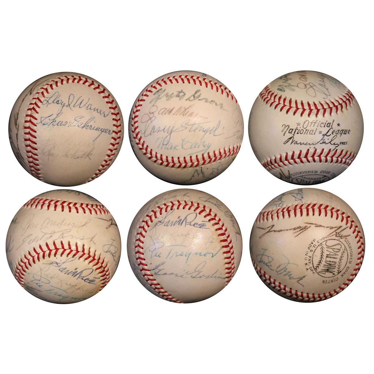 Baseball Hall of Famers signed Official National League baseball. This ball is covered with the signatures of these big names: Casey Stengel, Lefty Grove, Charlie Gehringer, Zack Wheat, Max Carey, Joe Medwick, Edd Roush, Heinie Manush, Frankie Frisch, Sam Rice, Red Ruffing, Pie Traynor, Goose Goslin, Ray Schalk, Joe Cronin and Lloyd Waner. Spalding baseball bears printed signature of Warren Giles, League President. Fading to some signatures. Overall very good.
