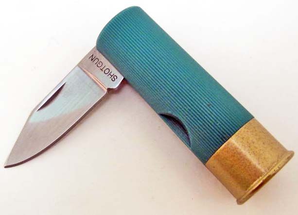 2 5/8" closed. Stainless clip blade. Green plastic shotgun shell casing handle.
