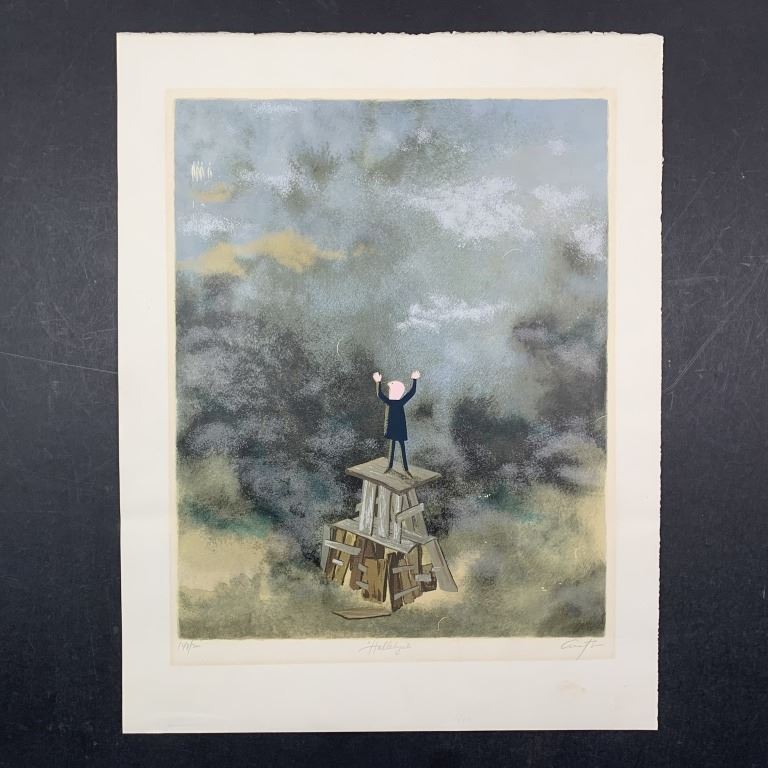A limited edition print, titled "Hallelujah", signed lower right, titled lower middle, and numbered 148/200 lower left. This piece is of a man, standing on raised wood, with his arms in the sky, appearing to be proclaiming 'hallelujan'. This piece is in good condition with some light toning to the paper around the image, and a few minor scratches to the print.