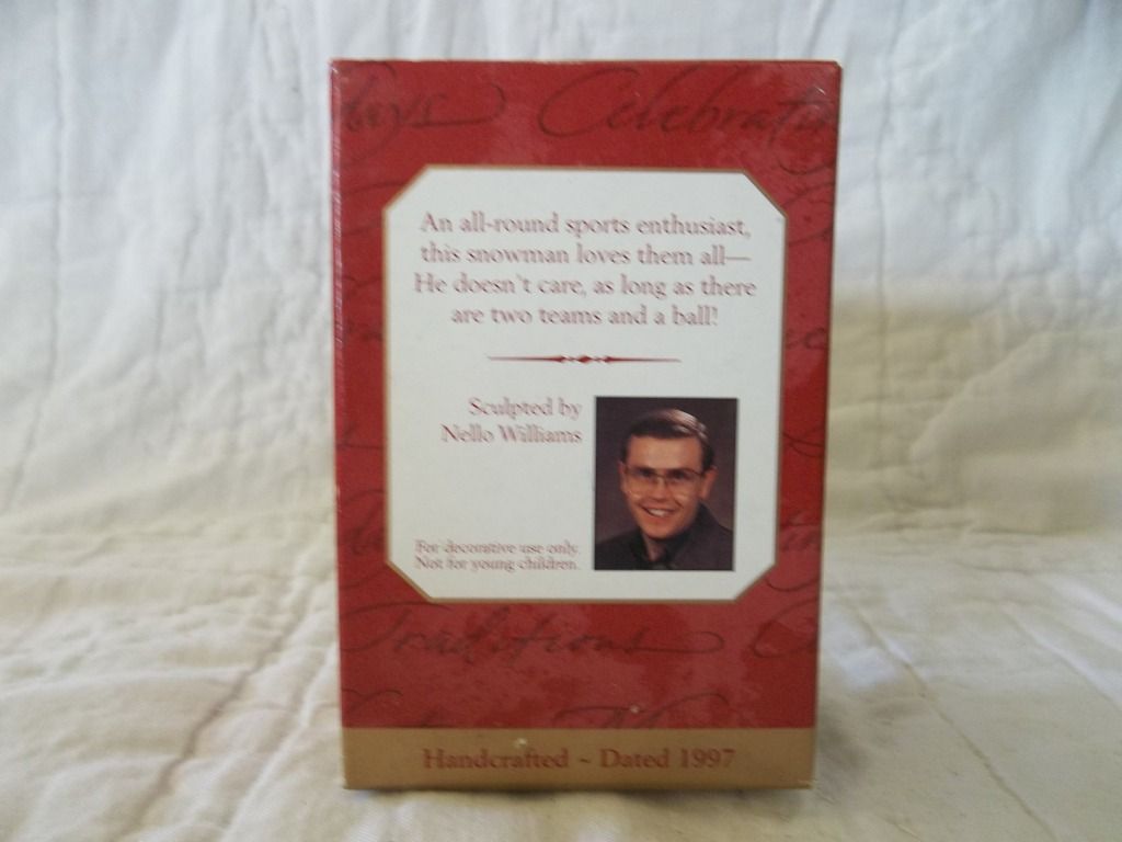 This ornament is snowman shaped. The snowman consists of a basketball, soccer ball and baseball and is holding a football in his hand covered with a boxing glove and holding a golf club in his hand covered with a goalie's hockey glove and wearing a baseball cap