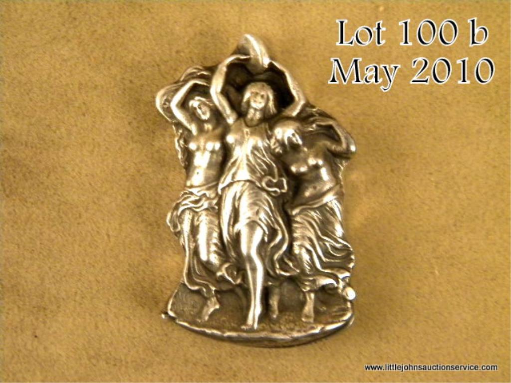 Hallmarked silver ornate match safe, approx. 2” X 1” with cast design of three dancing women in relief on the front of the safe with nicely engraved back and match striker on the lid. Est.: $100-$300.