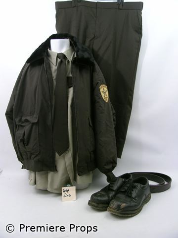 Deputy King (Mark Christopher Lawrence) button down with collar and dark brown pocket flaps and shoulders "Flying Cross" shirt (size 19.5), dark brown zip up with pockets and "Haddonfield Sheriff's Dept." patch at left shoulder "Flying Cross" jacket, Brown four pocket zipper fly "Flying Cross" pants (size 50 reg), black leather lace-up with rubber soles "Paul" shoes (size 12) brown leather with brass buckle "Boston" belt (size 50), brown clip on tie (Screen worn/includes wardrobe tag)
