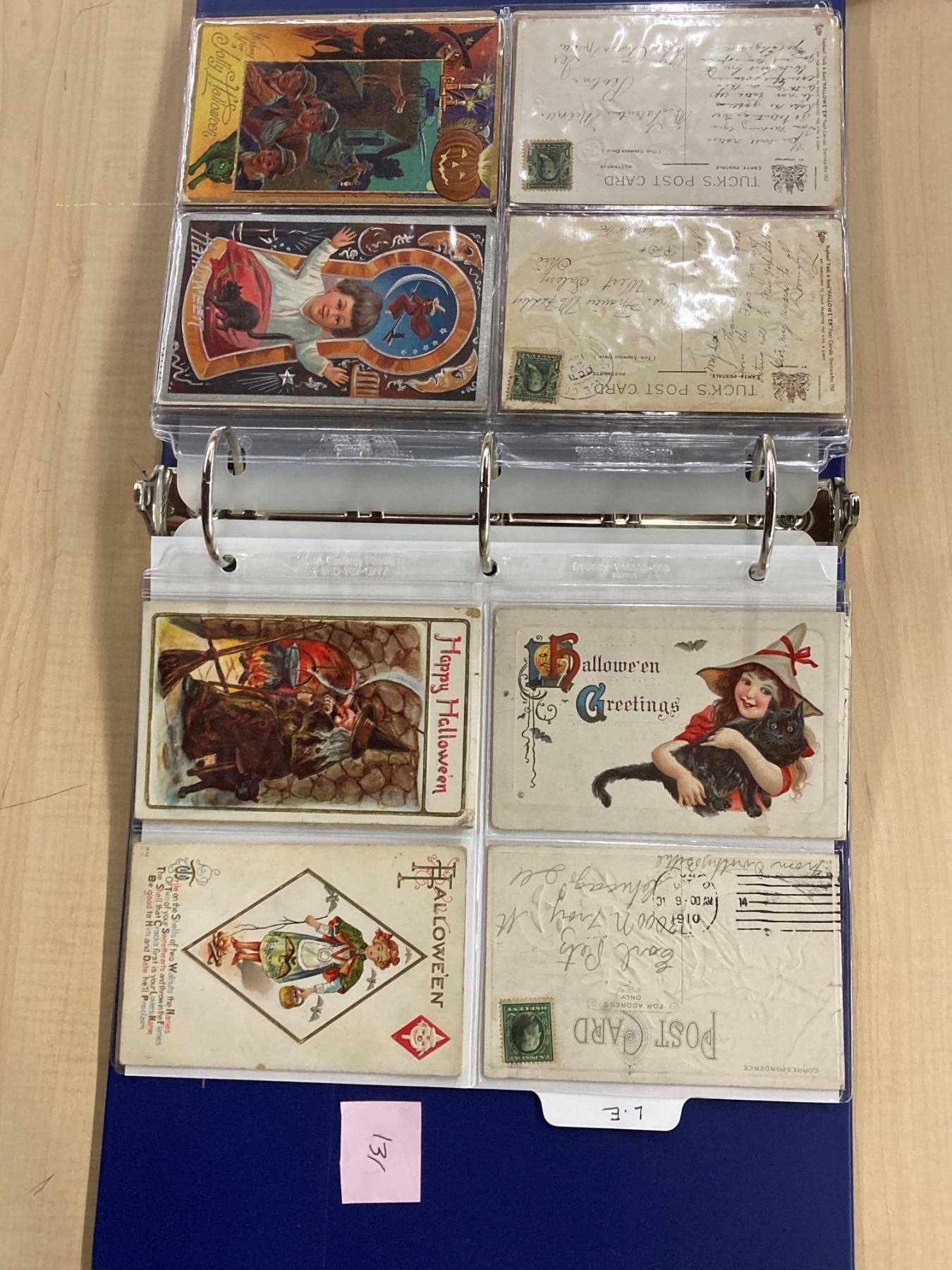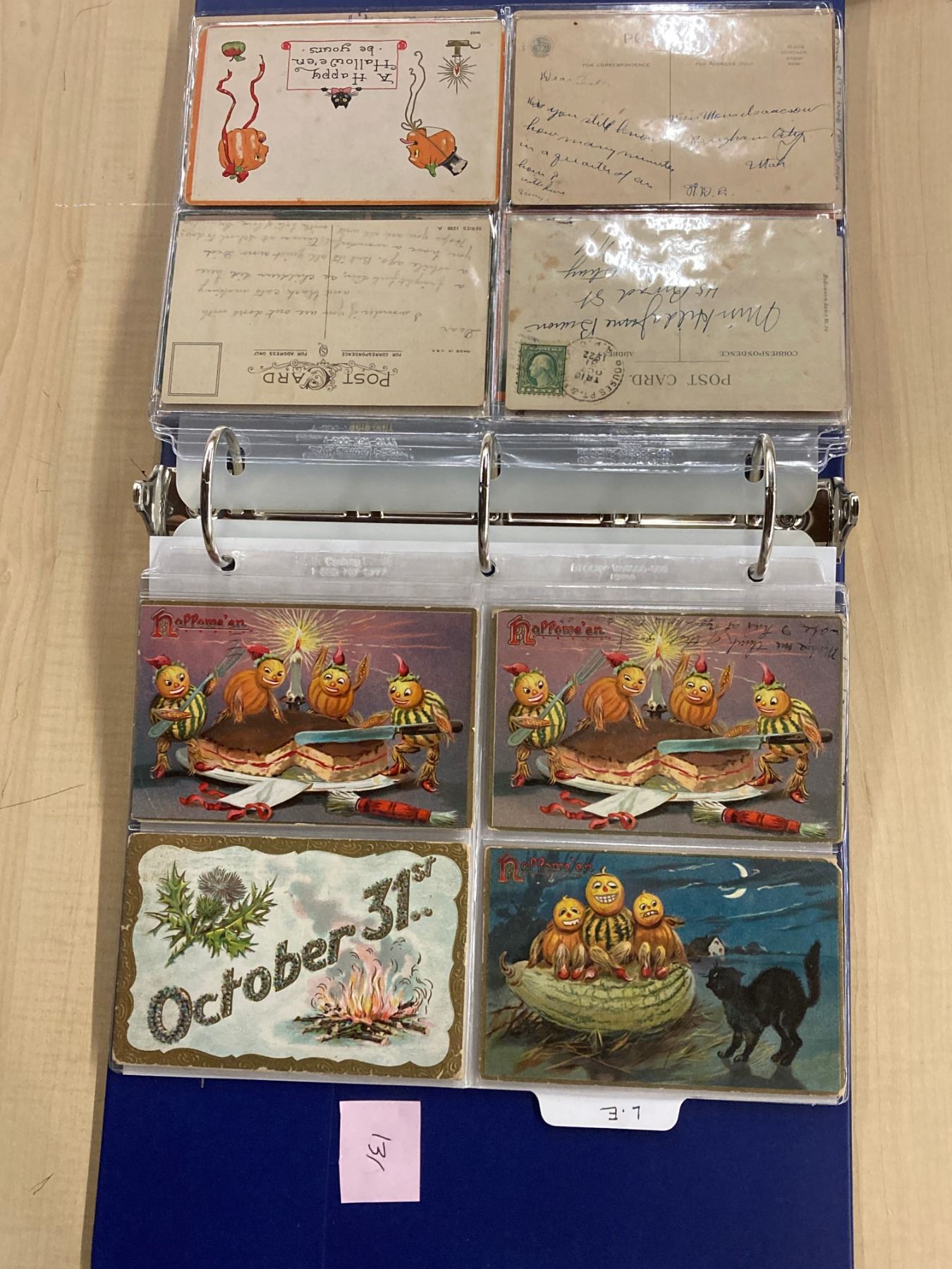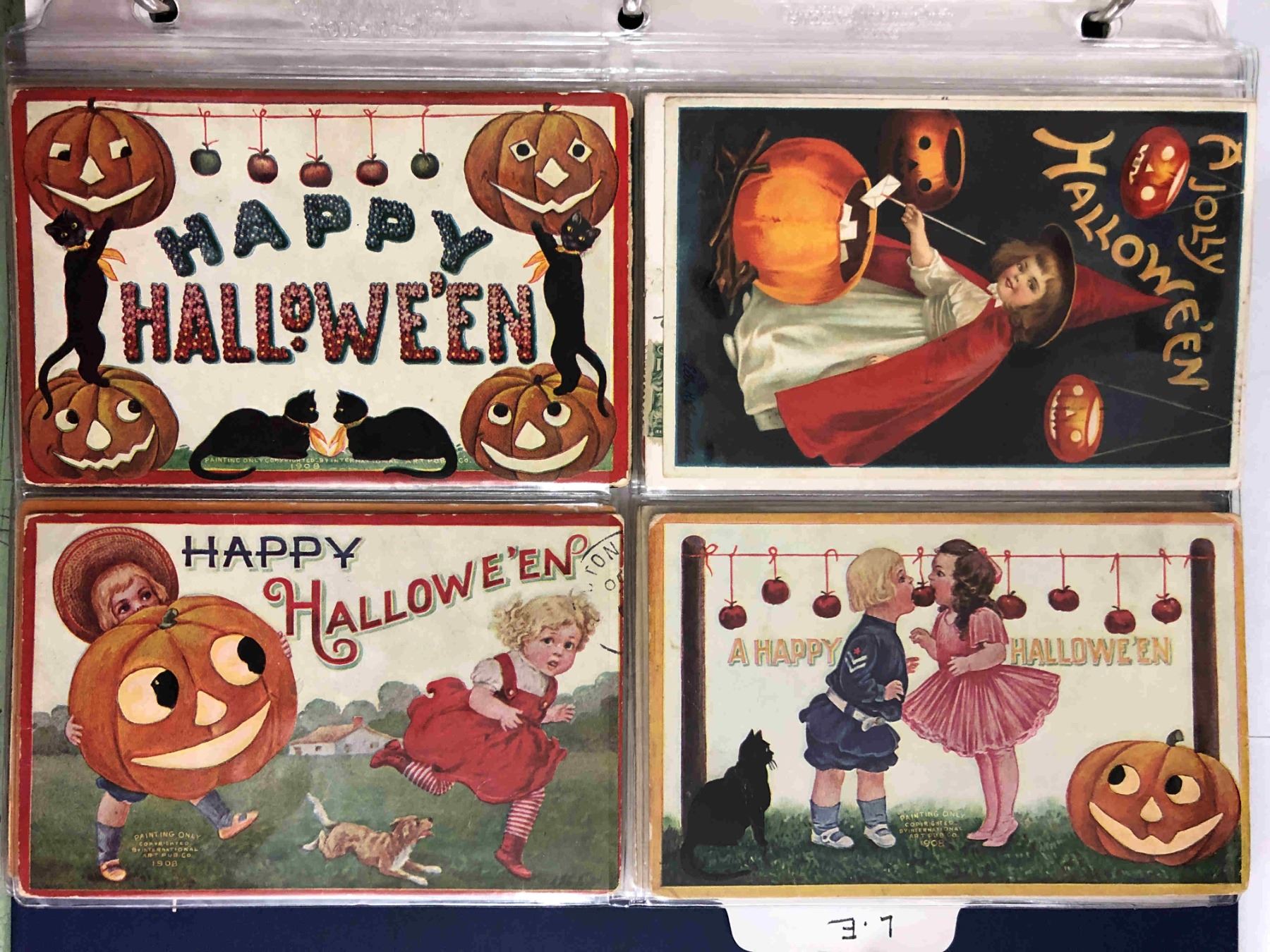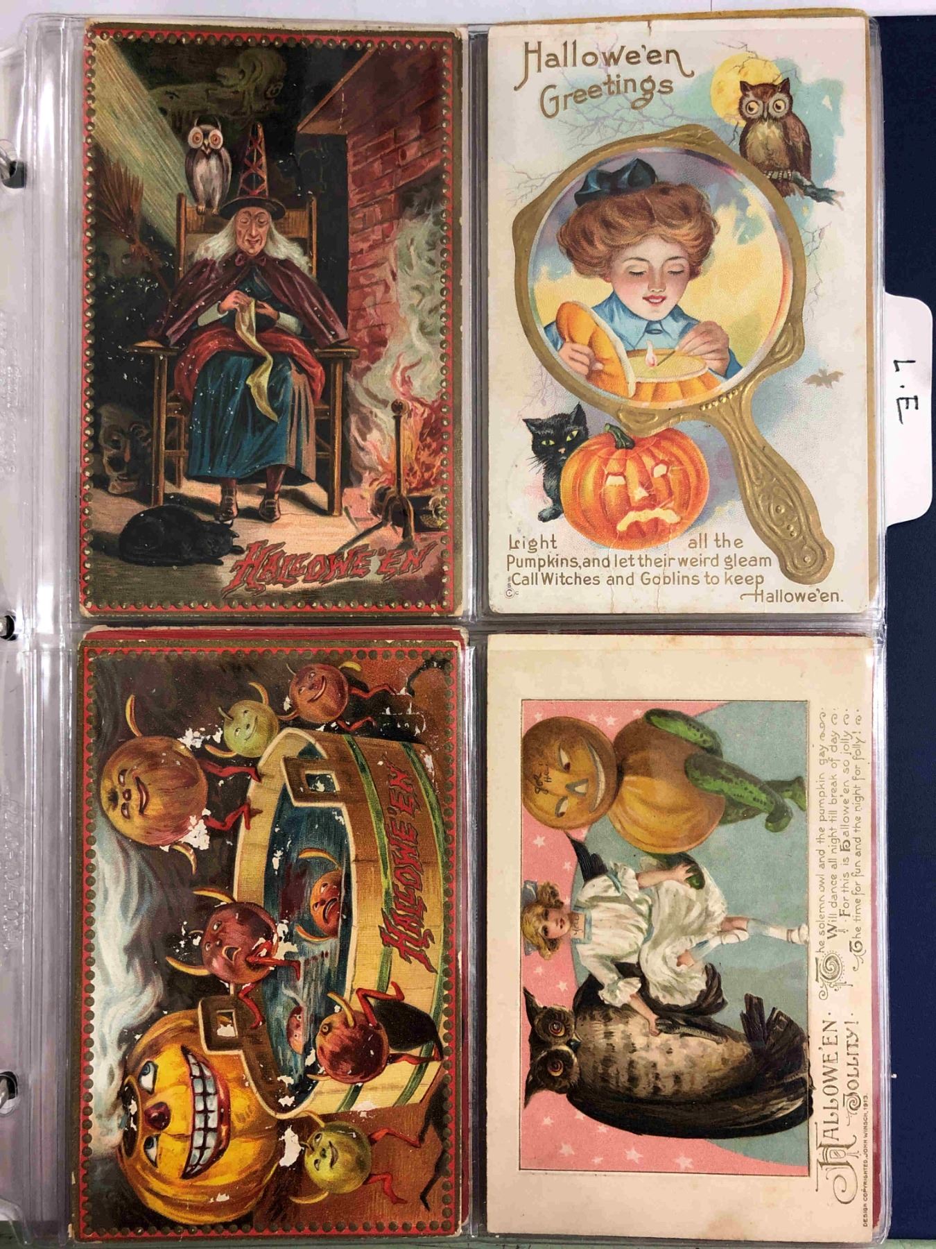 Album of Halloween postcards. Many Tucks, 1 Winsh. Pumpkins, cats, kids, witches & more. 30+ cards. Pictures shown are just a portion of the lot.