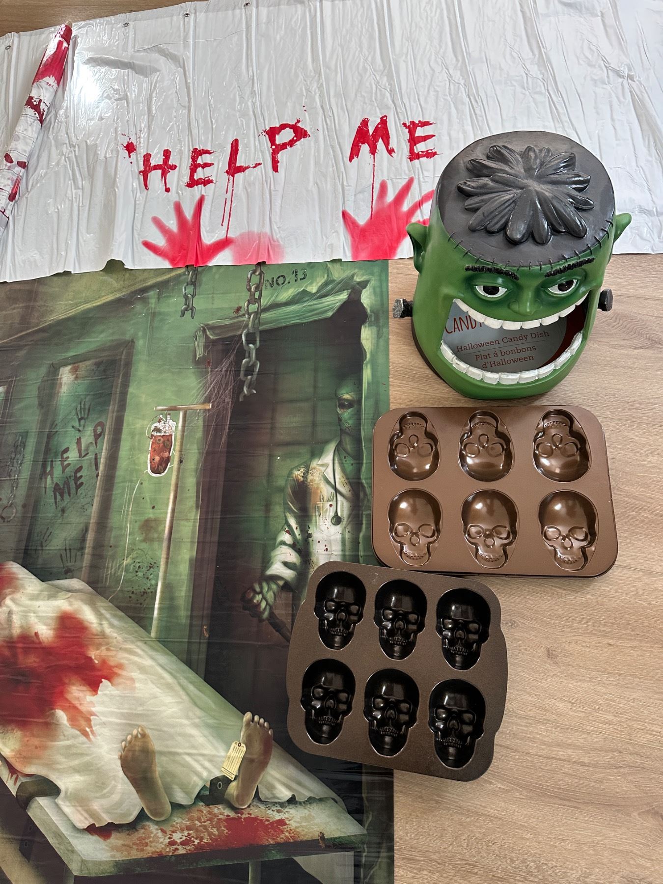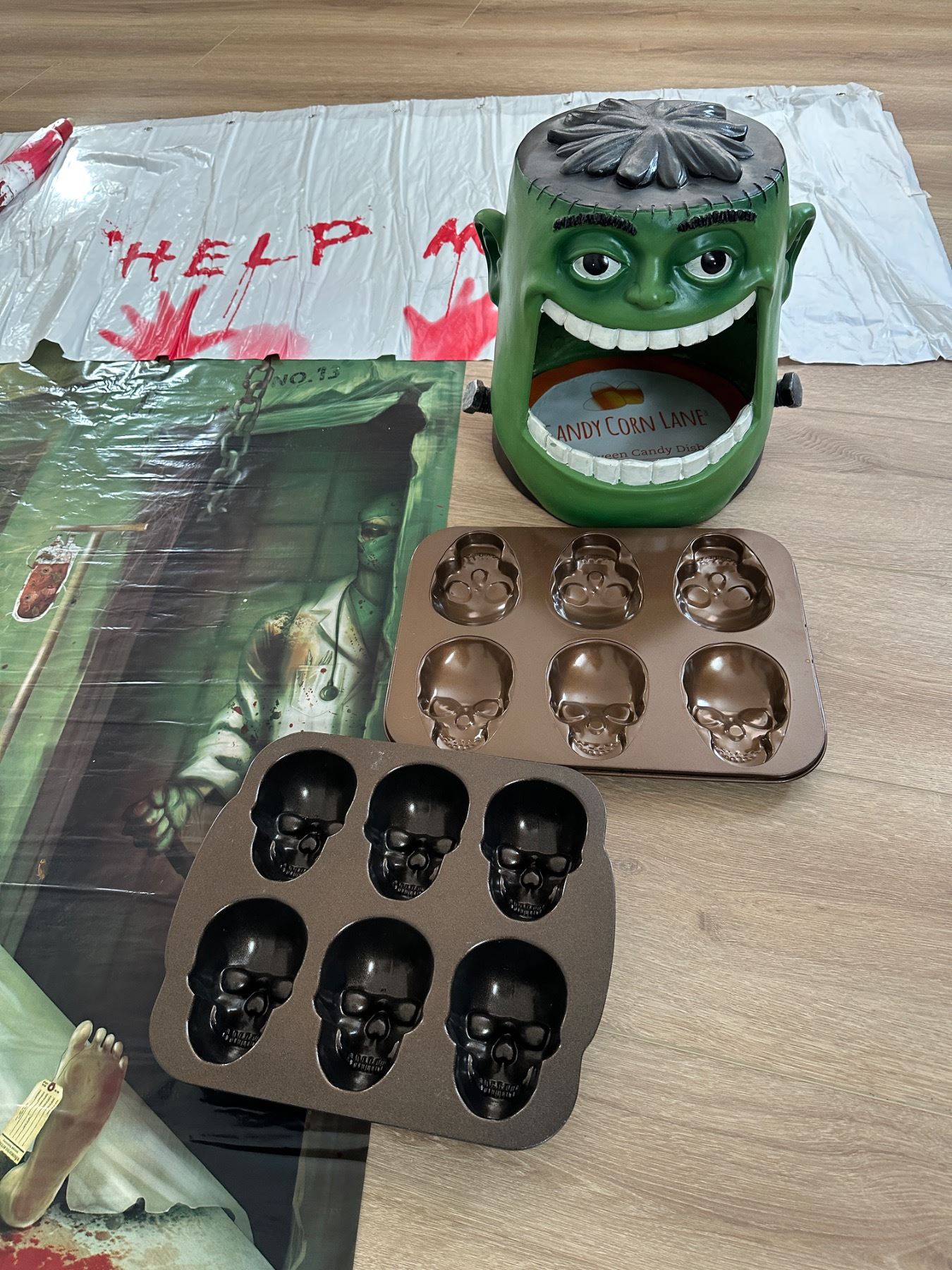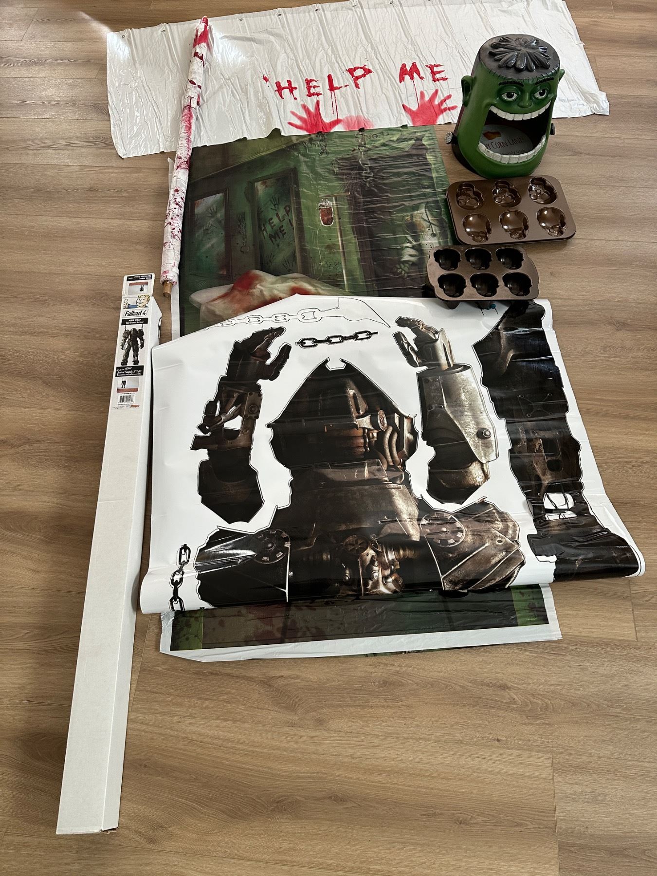 Includes FallOut 4 wall wrap (some missing stickers), candy dish, skull baking pans and plastic door covers