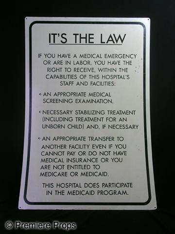 Halloween II - This is a white with black writing plastic hospital "It's The Law" admitting sign. (Approx. 36" x 24") This is taken from the Haddonfield Hospital set. This item will require additional shipping charges. Please email for shipping rates prior to bidding. (2HLW3051)
