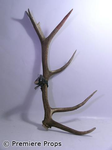 Halloween II - From the end of the summer horror hit, this is screen used, dirty and bloody, large brown real bone six point antlers with wood, tape, and wire contraption in the middle. This item will require additional shipping charges. Please email for shipping rates prior to bidding. (Approx. 39" x 24") (2HLW3008)