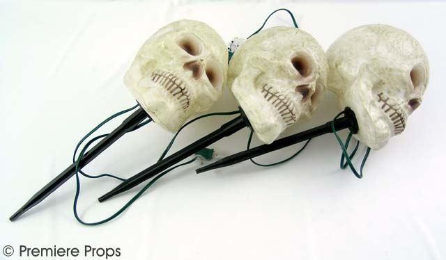 Light up skull lawn stake Halloween Decoration - (*Missing one skull) / Skulls are ~ 7", 17" with stake (set dec.)