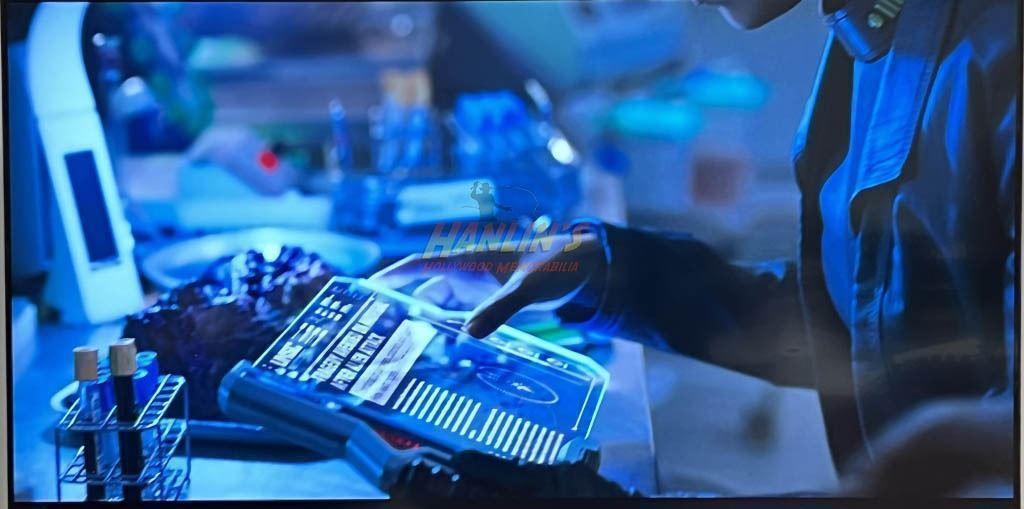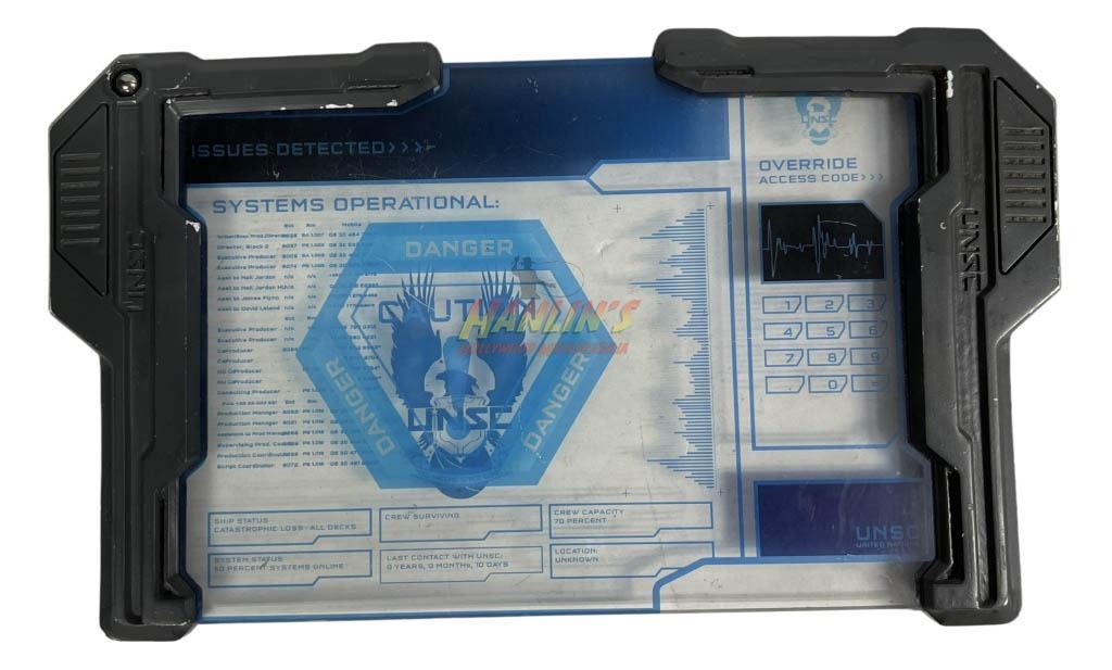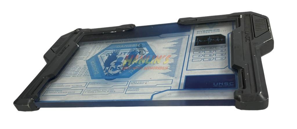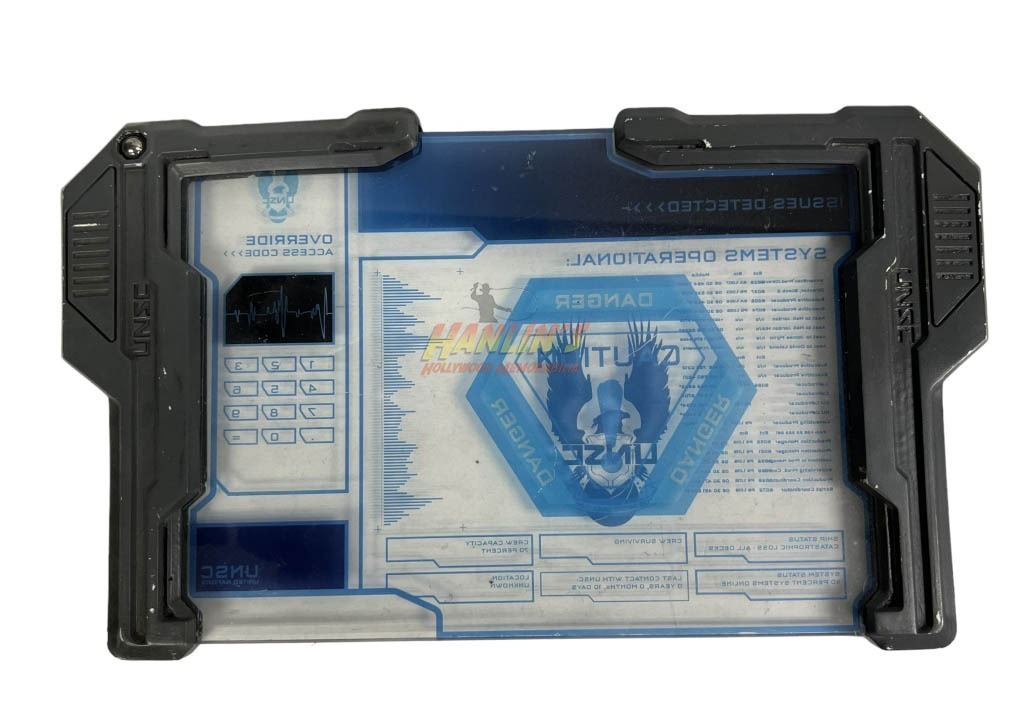 Original data padd used in the production of the Kyle Killen and Steven Kane created military science fiction television series 'Halo' (2022), based on the video game franchise of the same name which follows a 26th-century war between the United Nations Space Command and the Covenant, a theocratic-military alliance of several advanced alien races determined to eradicate the human race.